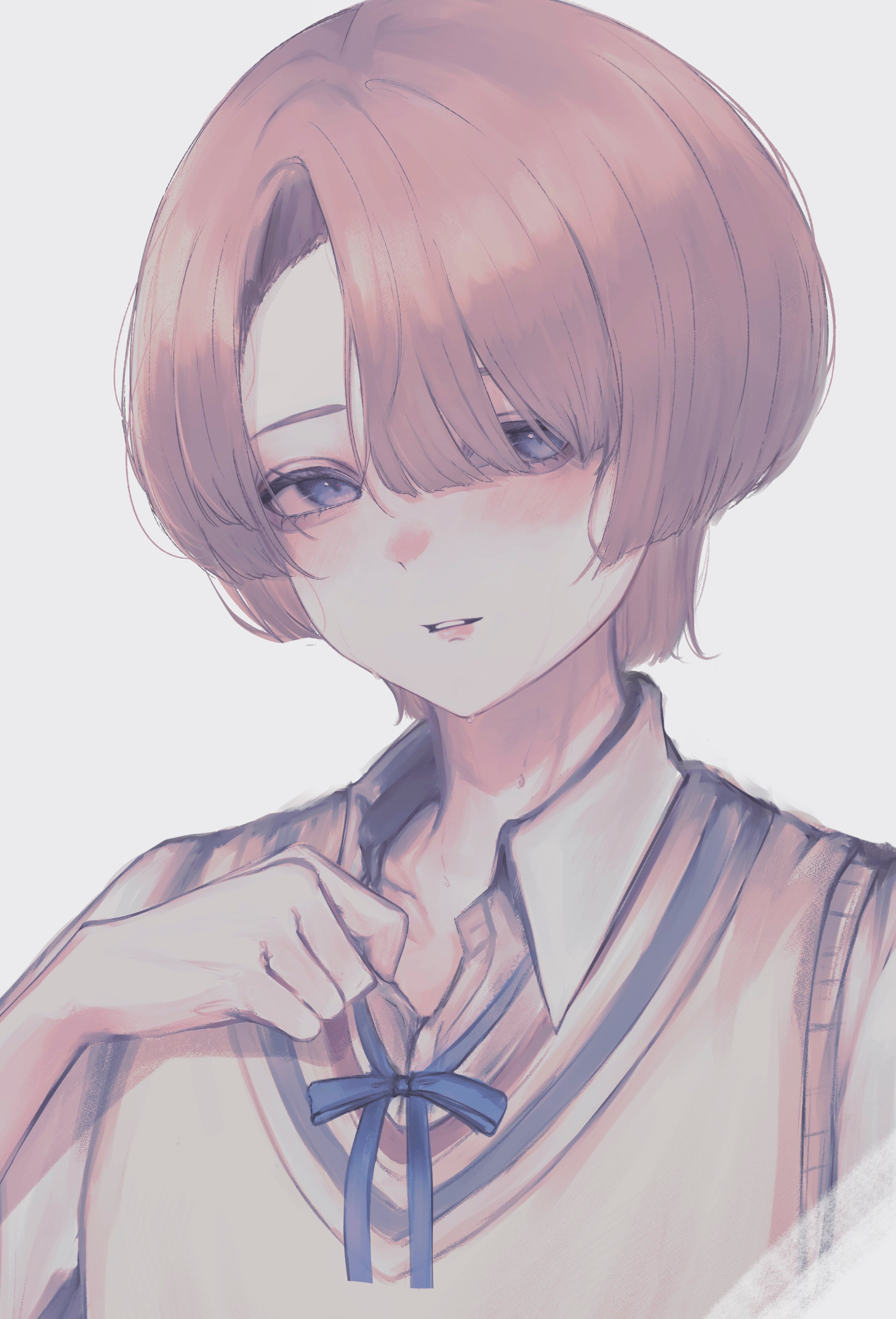 1girl absurdres arimura_mao asymmetrical_bangs blue_ribbon blush clothes_pull collarbone commentary dot_nose gakuen_idolmaster grey_background hair_over_one_eye hand_up hatsuboshi_gakuen_school_uniform highres idolmaster long_sleeves looking_at_viewer neck_ribbon nemuneeeeeeeemu parted_lips pink_hair purple_eyes ribbon school_uniform shirt shirt_pull short_hair simple_background smile solo sweater_vest white_shirt yellow_sweater_vest