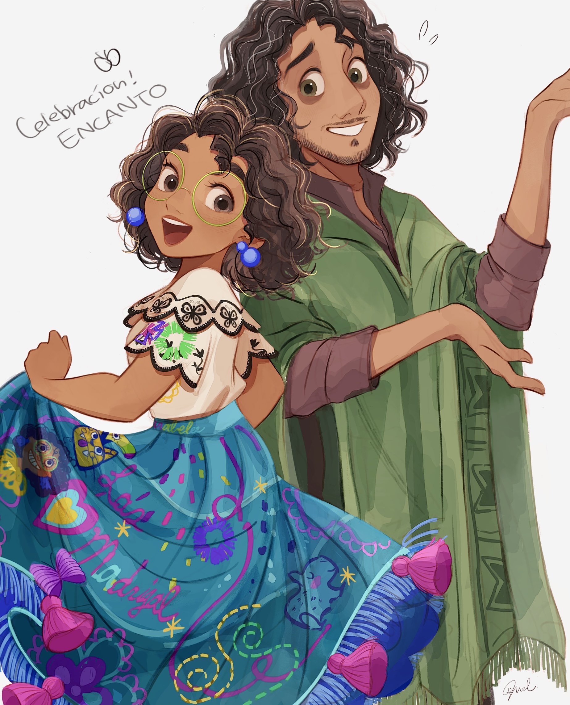 1boy 1girl aqua_skirt brown_eyes brown_hair brown_shirt bruno_madrigal copyright_name dark-skinned_female dark-skinned_male dark_skin encanto facial_hair green_poncho highres melchencanto mirabel_madrigal open_mouth poncho print_shirt print_skirt shirt short_hair short_sleeves simple_background skirt teeth uncle_and_niece upper_teeth_only white_background white_shirt