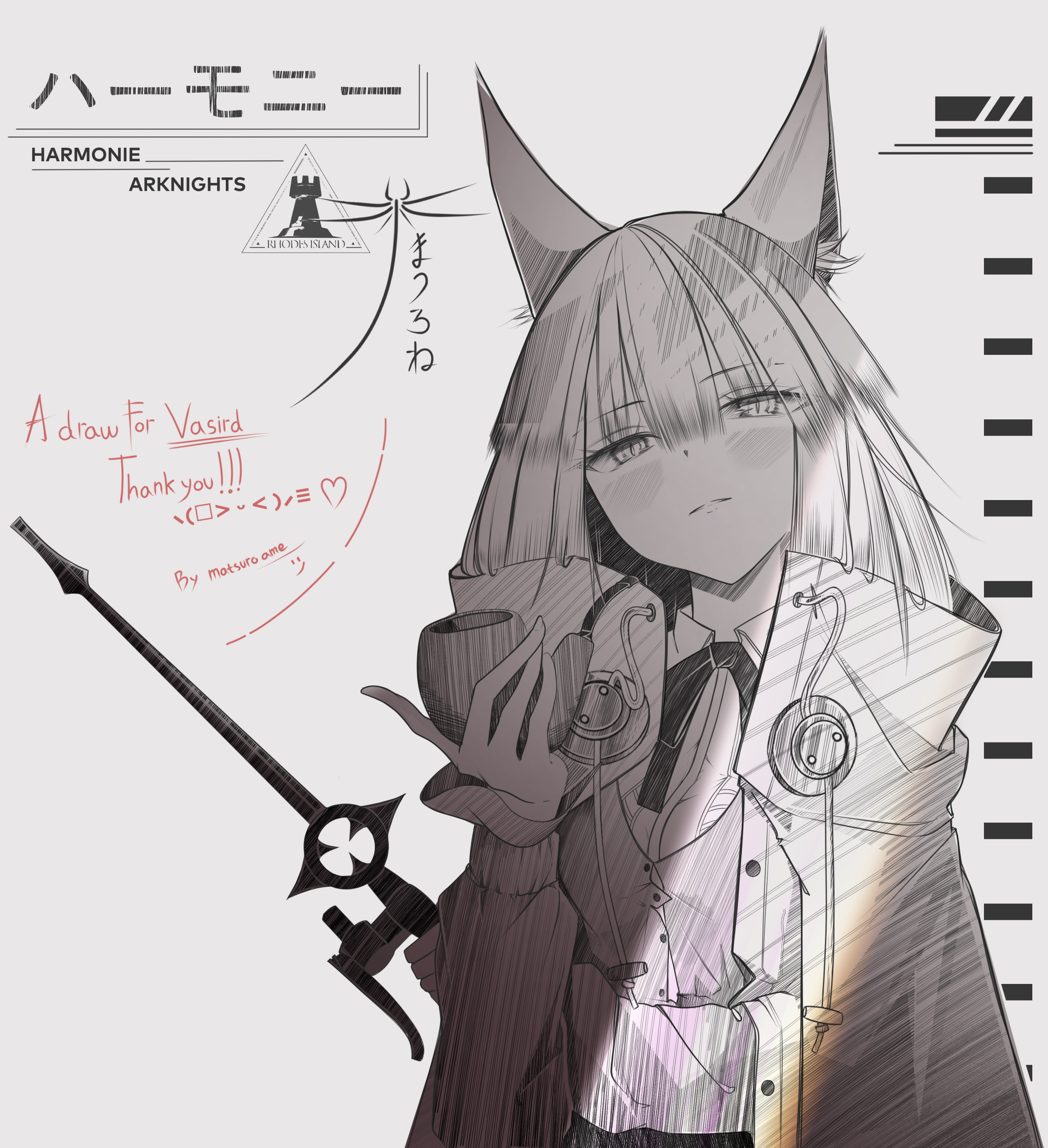 1girl absurdres animal_ears arknights artist_name blush cat_ears cat_girl character_name cloak closed_mouth commentary cup greyscale hair_between_eyes harmonie_(arknights) highres holding holding_cup long_sleeves looking_at_viewer matsuro_a medium_hair monochrome neck_ribbon rhodes_island_logo_(arknights) ribbon shade shirt solo upper_body vest