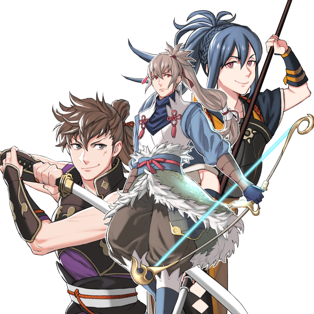 1girl 2boys blue_hair bow_(weapon) brown_eyes brown_hair fire_emblem fire_emblem_fates grey_hair hinata_(fire_emblem) holding holding_bow_(weapon) holding_polearm holding_sword holding_weapon katana minato_(robin) multiple_boys nintendo oboro_(fire_emblem) orange_eyes polearm sword takumi_(fire_emblem) weapon