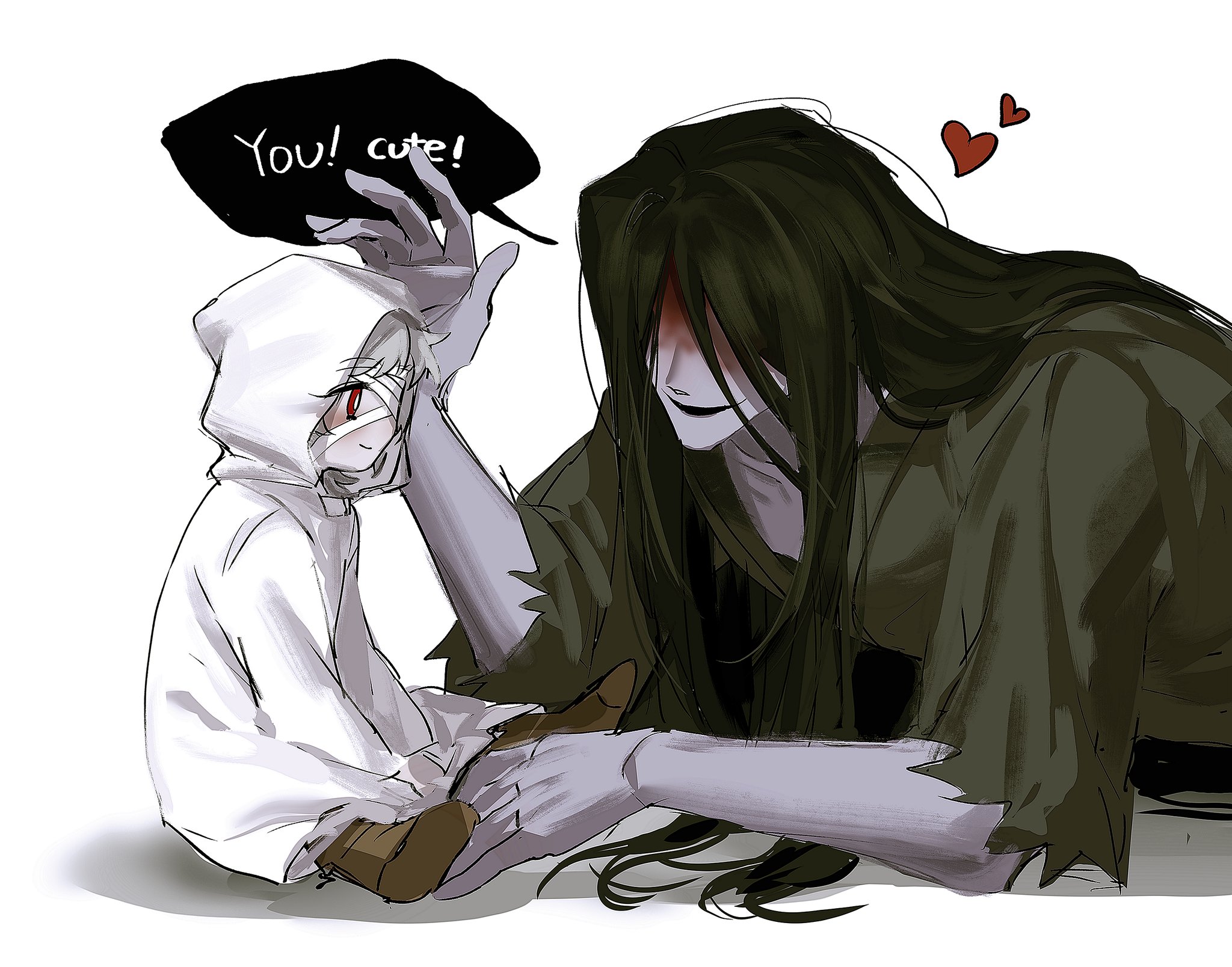 aged_down bandaged_head bandages black_hair black_kimono blood blood_on_face child english_text grey_hair adashino_adami highres homicipher japanese_clothes jit1244 kimono long_hair looking_at_viewer lying mr._crawling on_stomach raincoat red_eyes short_hair simple_background sitting very_long_hair white_background white_raincoat