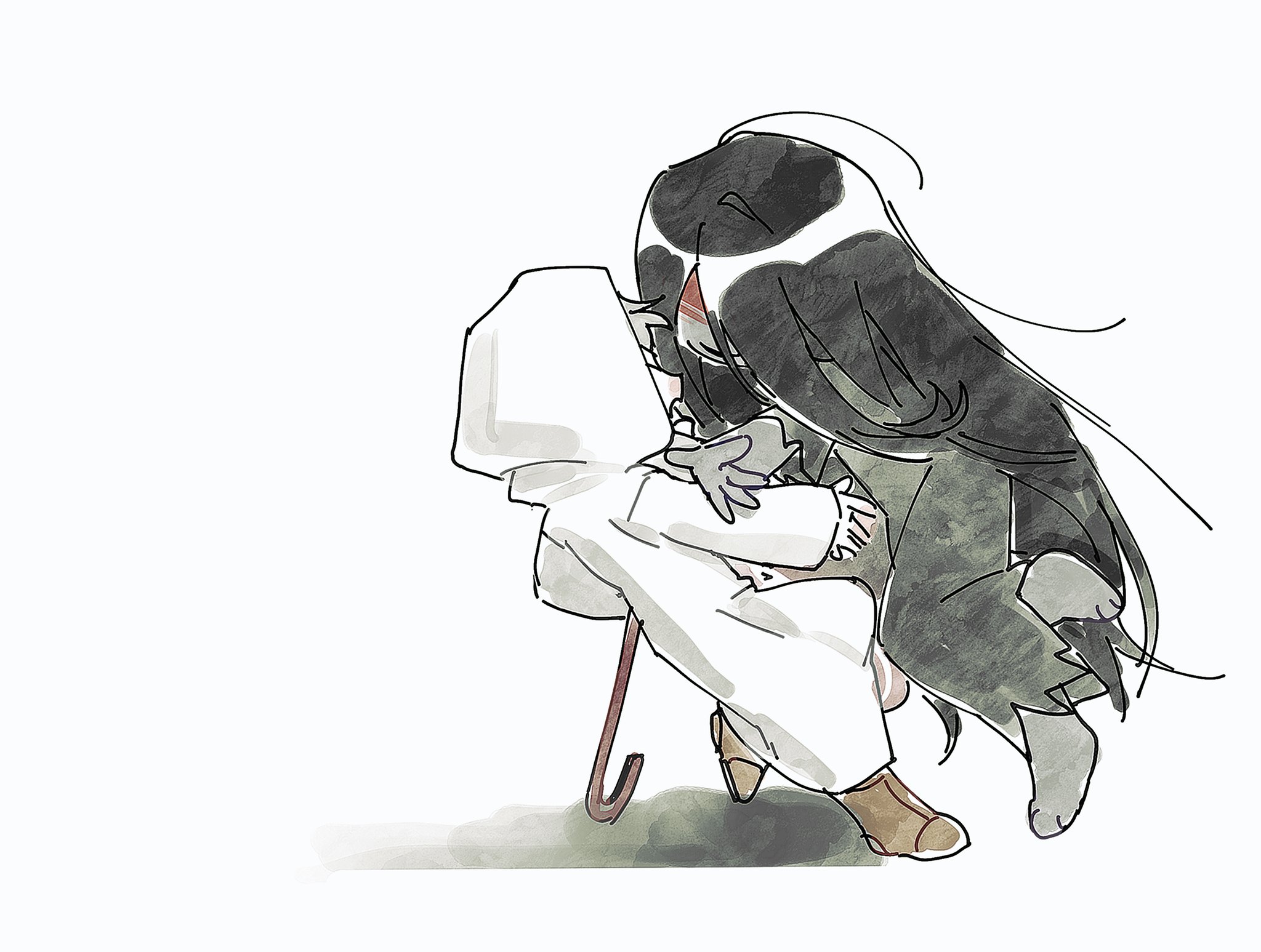 1boy 1girl black_hair black_kimono blood blood_on_face crowbar deformed full_body glomp grey_hair adashino_adami highres holding holding_crowbar homicipher hug japanese_clothes jit1244 kimono long_hair mr._crawling raincoat simple_background very_long_hair white_background white_raincoat