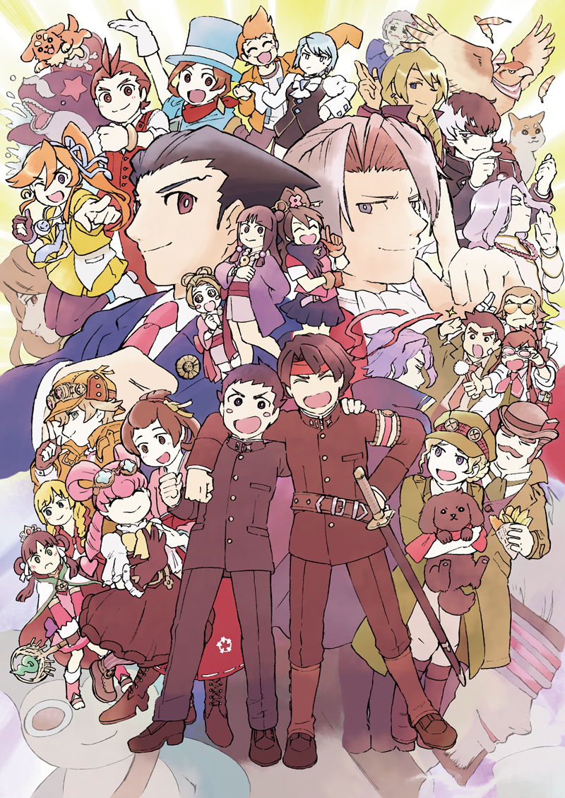 6+boys 6+girls ace_attorney arm_around_shoulder bird black_hair blonde_hair blue_hair blush_stickers braid brown_gloves brown_hair character_request commentary_request cro_iz dick_gumshoe dog ema_skye facial_hair feathers fingerless_gloves franziska_von_karma gakuran gloves godot_(ace_attorney) goggles goggles_on_head hair_ornament hat herlock_sholmes japanese_clothes jewelry kay_faraday kimono larry_butz magatama magatama_necklace maya_fey mia_fey miles_edgeworth missile_(ace_attorney) multiple_boys multiple_girls mustache necklace necktie one_eye_closed orange_hair orca pearl_fey phoenix_wright pink_hair red_necktie school_uniform sphere_hair_ornament sword the_great_ace_attorney top_hat weapon wendy_oldbag