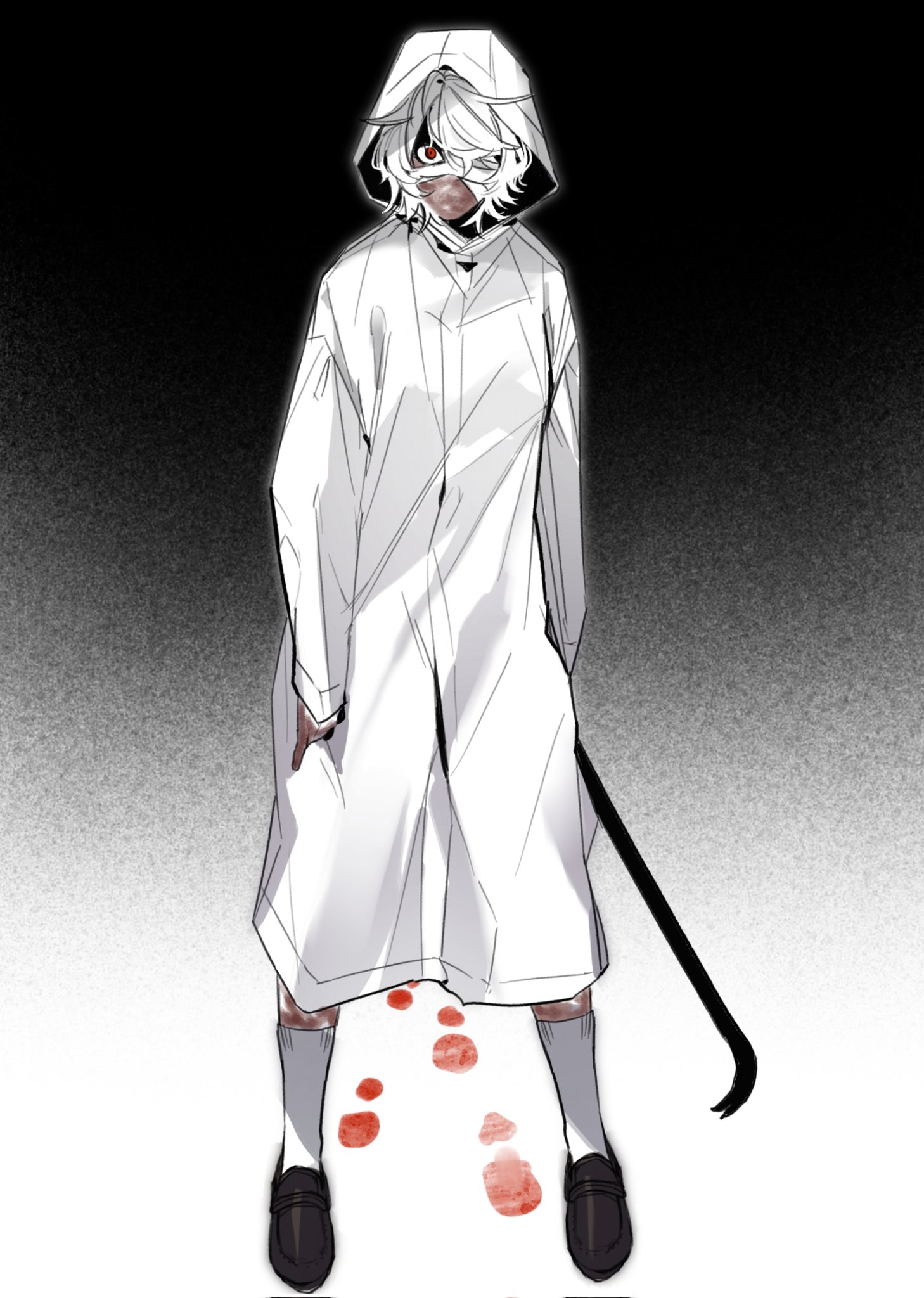 1girl bandaged_head bandages black_background blood blood_on_face blood_on_hands crowbar full_body gradient_background hair_over_one_eye adashino_adami highres holding holding_crowbar homicipher looking_at_viewer md_1211_zzz raincoat red_eyes short_hair solo standing white_hair white_raincoat