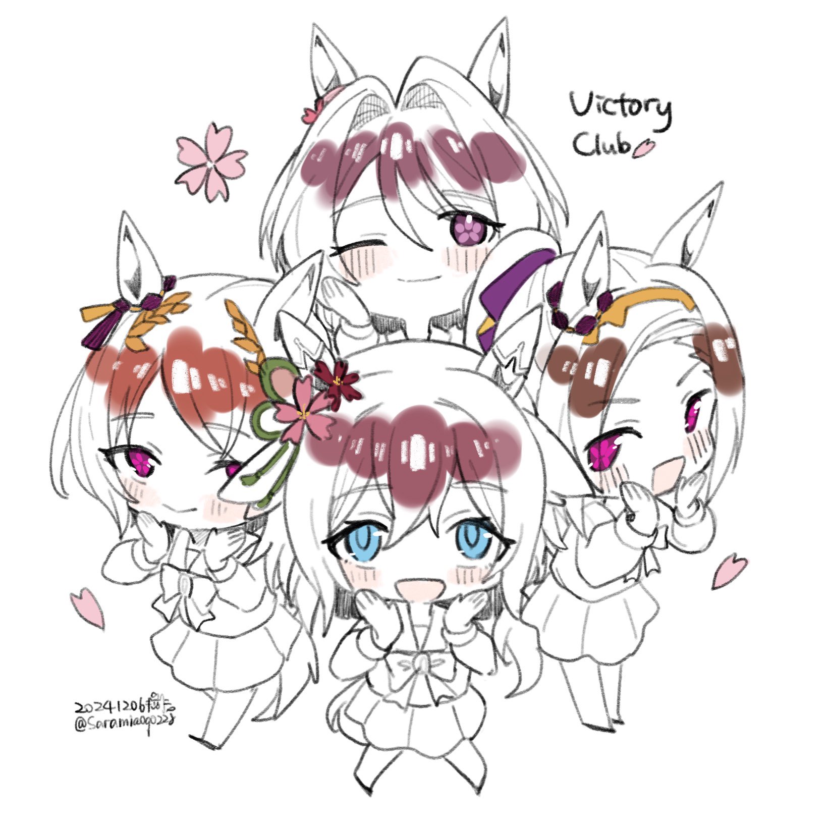 4girls animal_ears blue_eyes blush breasts chibi dated hair_between_eyes hair_ornament highres horse_ears horse_girl horse_tail long_hair looking_at_viewer multiple_girls petals pink_eyes sakura_bakushin_o_(umamusume) sakura_chitose_o_(umamusume) sakura_chiyono_o_(umamusume) sakura_laurel_(umamusume) saramiao-chan school_uniform smile tail twitter_username umamusume white_background