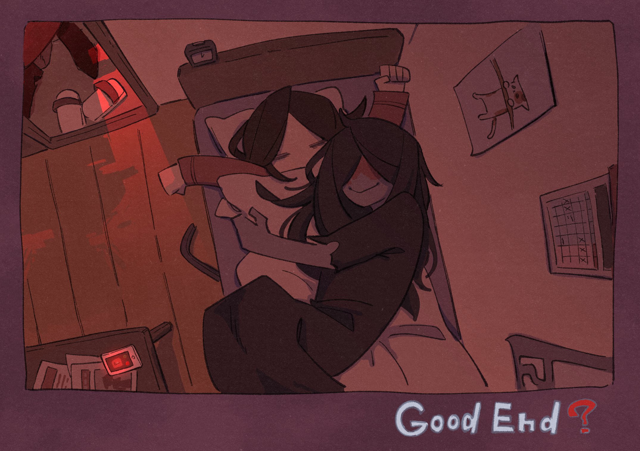 1girl 2boys adashino_adami bedroom black_hair black_kimono blood blood_on_face brown_hair chinese_commentary closed_eyes commentary_request day english_text hang_in_there_(meme) highres homicipher hug impending_doom indoors japanese_clothes kimono meme mixed-language_text mr._crawling mr._scarletella multiple_boys on_bed sleeping translation_request under_covers yeeeaaah10301