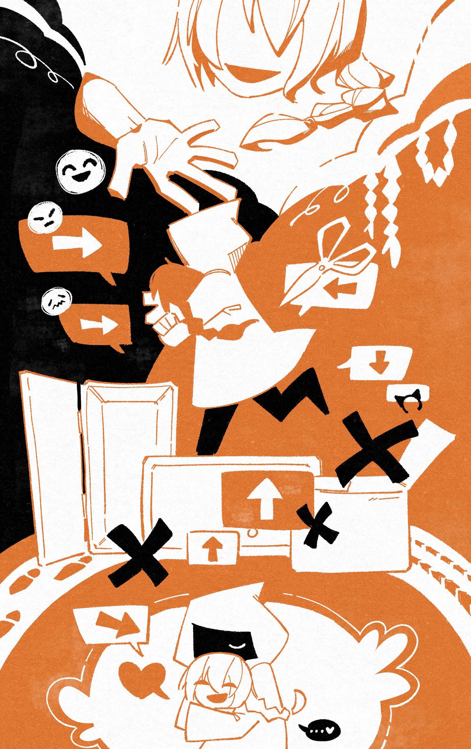 1boy 1girl absurdres arrow_(symbol) braid adashino_adami highres holding_detached_head homicipher long_hair mr._chopped orange_hair orange_theme raincoat running severed_head yeeeaaah10301