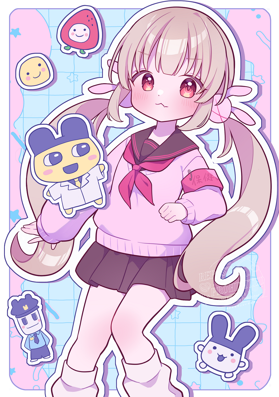black_skirt blonde_hair blue_sailor_collar blush closed_mouth commentary_request fang hair_ornament highres low_twintails natori_sana natori_sana_(school_uniform) neckerchief orange_eyes pink_shirt rabbit_hair_ornament red_neckerchief sailor_collar sana_channel school_uniform serafuku shirt skirt socks tamagotchi tamagotchi_(creature) twintails umecha_0 virtual_youtuber white_socks