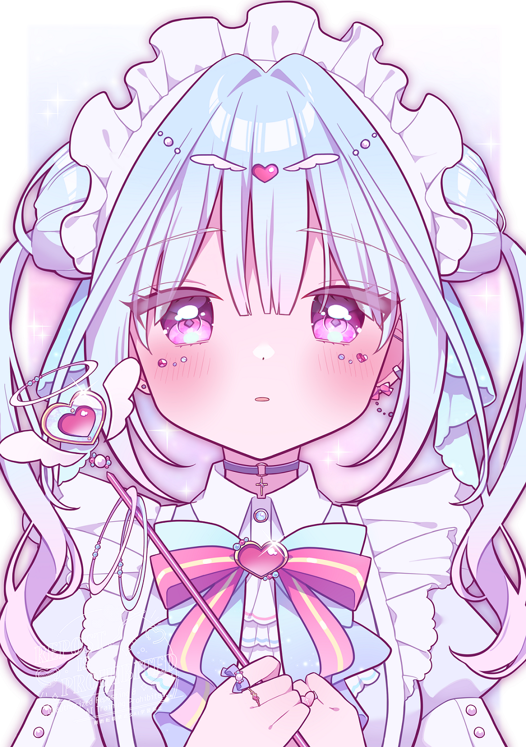 1girl blue_hair blush bow bowtie choker collared_shirt commentary_request earrings gradient_hair heart highres holding jewelry looking_at_viewer maid_headdress multicolored_hair open_mouth original pink_eyes pink_hair shirt solo two-tone_hair umecha_0 white_shirt