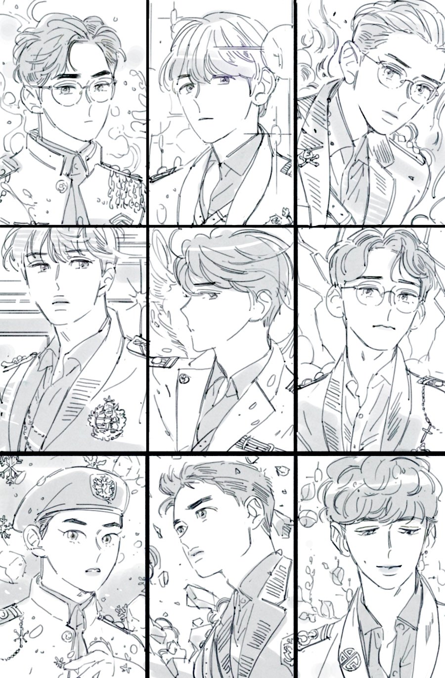 6+boys artist_name_(singer) baekhyun_(exo) chanyeol_(exo) chen_(exo) d.o._(exo) east_asian exo greyscale hat highres idol k-pop kai_(exo) langmanpanda lay_(exo) monochrome multiple_boys sehun_(exo) suho_(exo) upper_body xiumin_(exo)