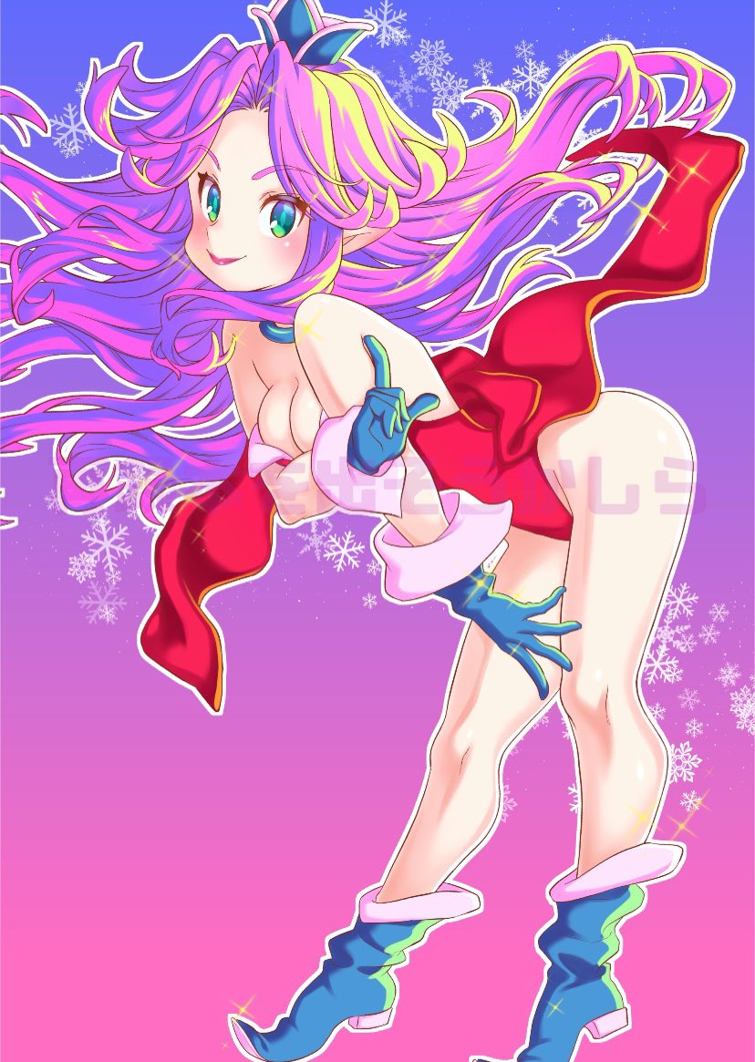 1girl angela_(seiken_densetsu_3) bare_shoulders blue_background blue_boots blue_choker blue_gloves blue_hat boots breasts choker cleavage full_body gloves gradient_background green_eyes hat leotard long_hair looking_at_viewer medium_breasts mini_hat motoko_(taom) parted_bangs pink_background pointy_ears purple_hair red_leotard seiken_densetsu seiken_densetsu_3 sidelocks smile solo