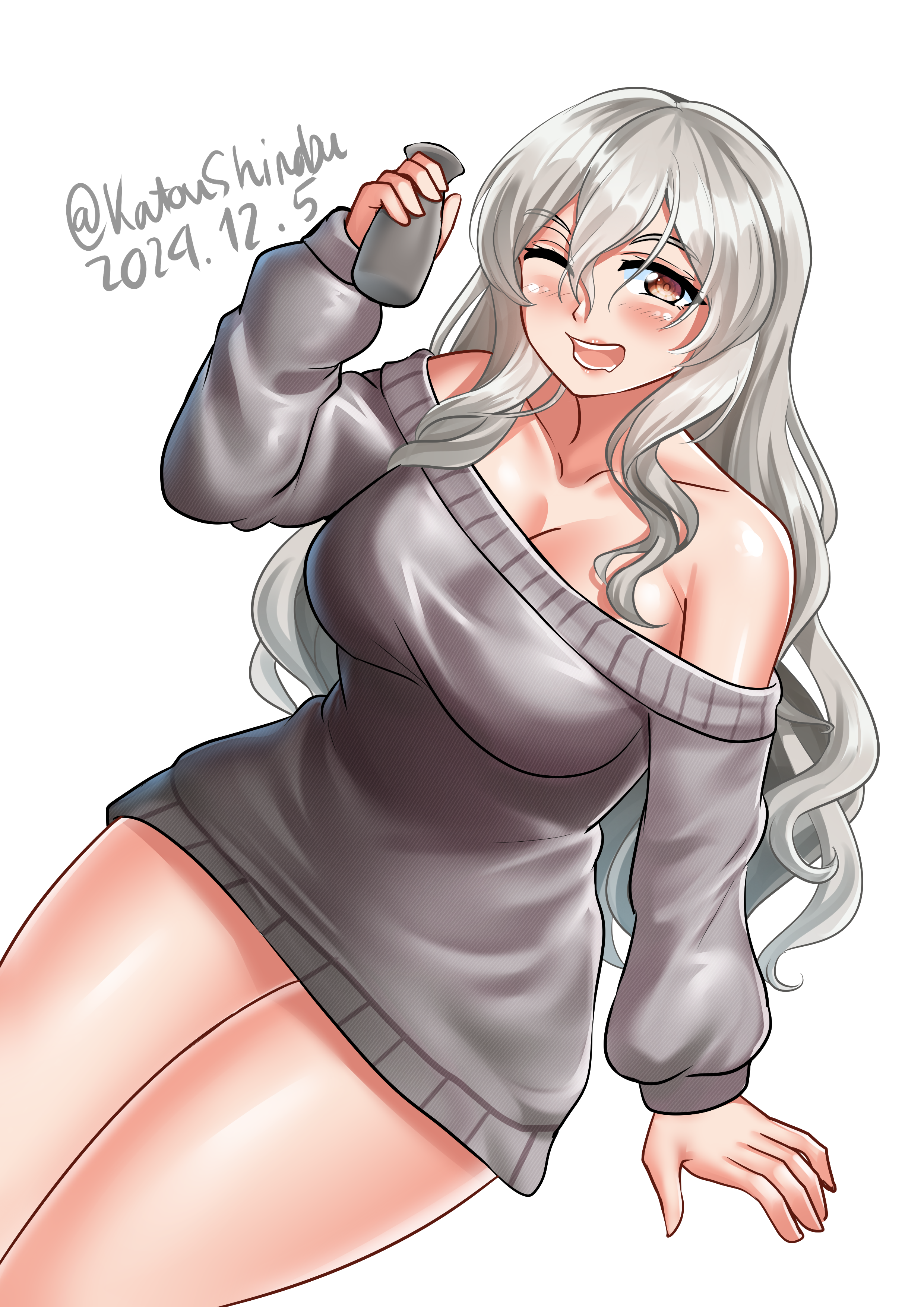 1girl absurdres bottle breasts brown_eyes commentary cowboy_shot dated dress english_commentary grey_dress grey_hair highres holding holding_bottle kantai_collection katou_shinobu large_breasts long_hair looking_at_viewer off-shoulder_dress off_shoulder official_alternate_costume one_eye_closed pola_(kancolle) pola_(saury_festival)_(kancolle) sitting smile solo sweater sweater_dress tokkuri twitter_username white_background