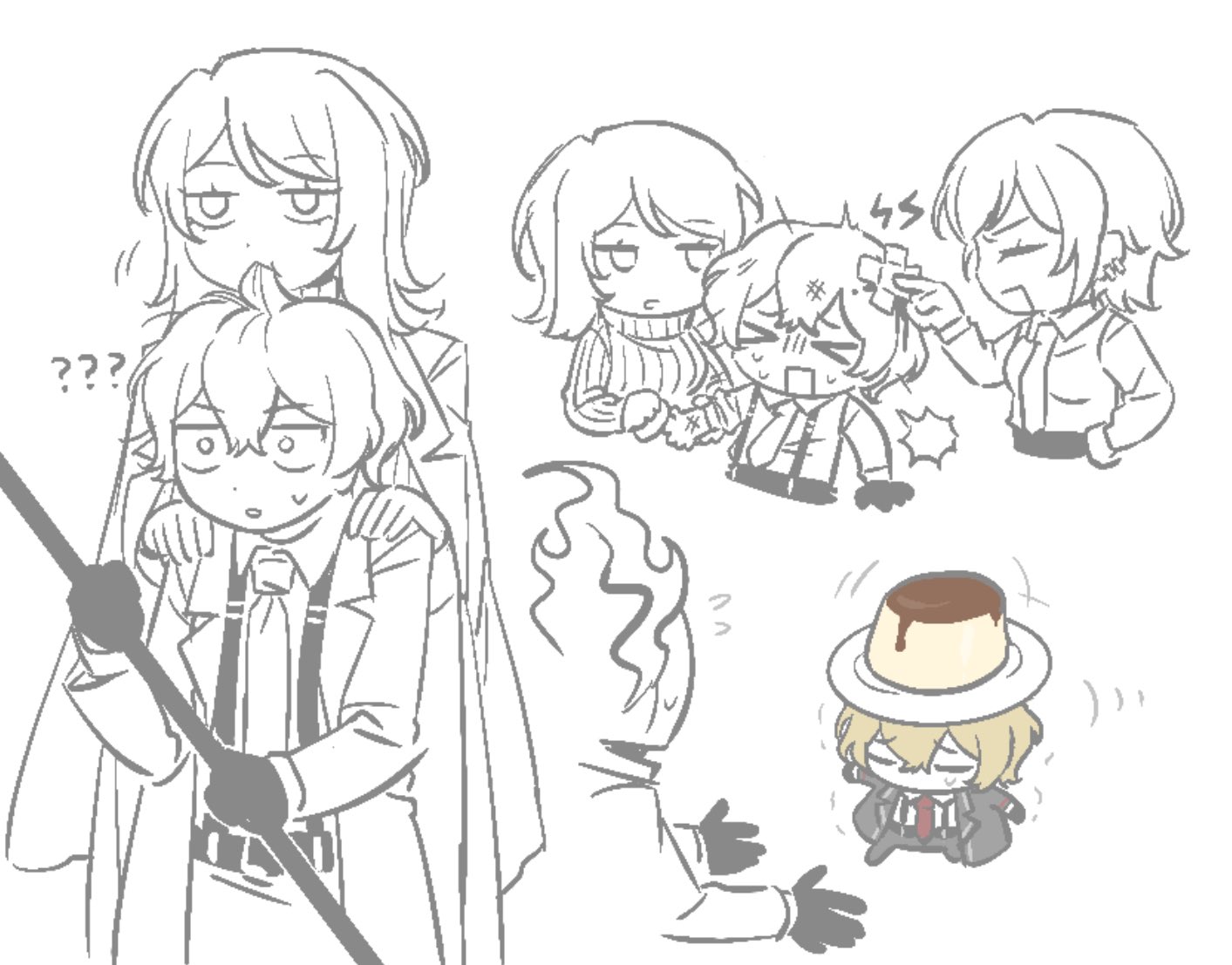 1other 2girls coat collared_shirt cowboy_shot dante_(limbus_company) eating_hair faust_(project_moon) food gloves greyscale holding holding_weapon limbus_company long_sleeves monochrome multiple_girls necktie ohzv open_mouth outis_(project_moon) plate project_moon pudding shirt short_hair sinclair_(project_moon) suspenders sweater weapon