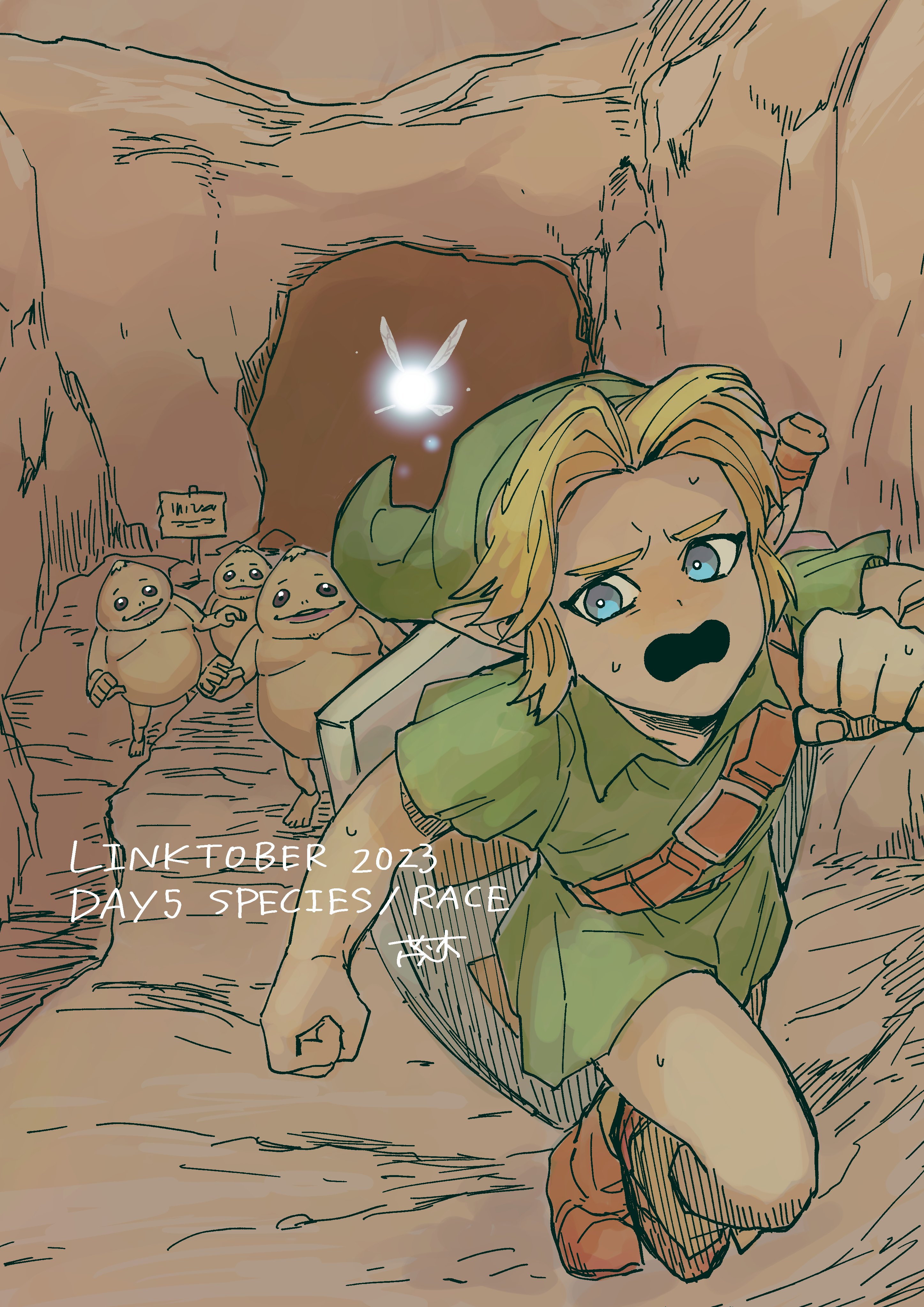 1boy 2023 3others absurdres belt blonde_hair blue_eyes boots brown_boots cave dated fairy full_body goron green_tunic hat highres link looking_back multiple_others navi nintendo open_mouth outdoors pointy_ears running shield shield_on_back shrub_mtg sign solo sweat the_legend_of_zelda the_legend_of_zelda:_ocarina_of_time tunic young_link