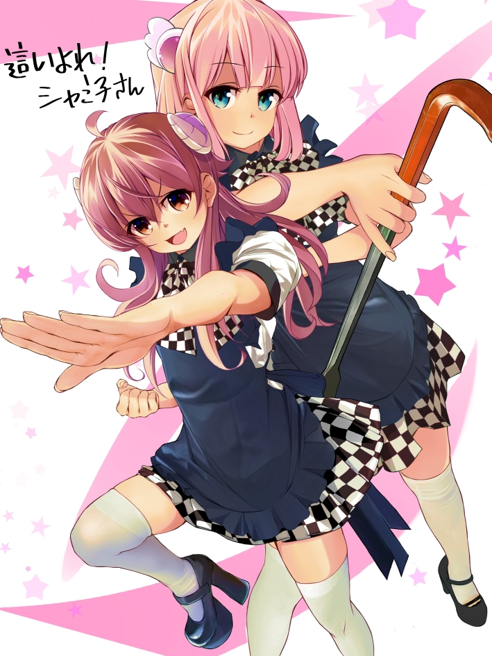 2girls ahoge apron aqua_eyes black_apron black_footwear blunt_bangs bob_cut brown_eyes brown_hair checkered_clothes checkered_skirt chiyoda_momo chuutaro_metal clenched_hand closed_mouth commentary cosplay crowbar curled_horns demon_girl demon_horns fang fighting_stance foot_out_of_frame foreshortening frilled_apron frills hair_between_eyes haiyore!_nyaruko-san henshin_pose holding holding_crowbar horns long_hair looking_at_viewer machikado_mazoku mary_janes medium_hair multiple_girls nyarlathotep_(nyaruko-san) nyarlathotep_(nyaruko-san)_(cosplay) open_mouth outstretched_arm pink_hair pinky_out shoes short_sleeves simple_background skin_fang skirt smile smug standing standing_on_one_leg star_(symbol) thighhighs translated v-shaped_eyebrows white_background white_skirt white_thighhighs yoshida_yuuko zettai_ryouiki