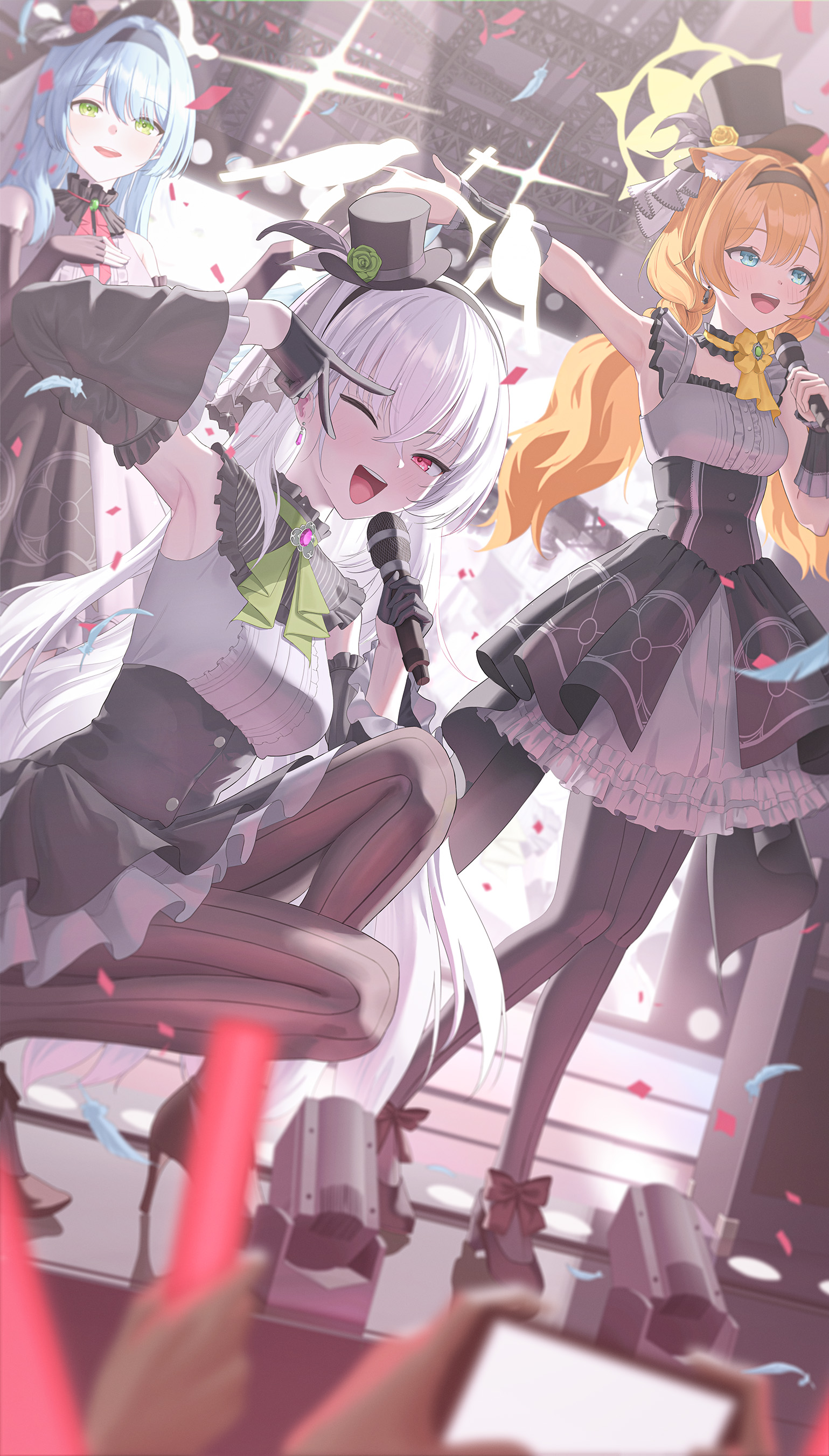 3girls ;d absurdres arm_up armpits black_footwear black_gloves black_hat black_overskirt black_pantyhose blue_archive blue_hair breasts center_frills commentary confetti detached_sleeves earrings frills gloves glowstick grey_hair grey_shirt grey_skirt hat high-waist_skirt high_heels highres holding holding_glowstick holding_microphone holding_phone idol_clothes jewelry mari_(blue_archive) mari_(idol)_(blue_archive) medium_breasts microphone mine_(blue_archive) mine_(idol)_(blue_archive) mini_hat multiple_girls official_alternate_costume one_eye_closed open_mouth orange_hair outstretched_arm pantyhose phone sakurako_(blue_archive) sakurako_(idol)_(blue_archive) shirt shugo_15 skirt smile squatting stage teeth upper_teeth_only v v_over_eye