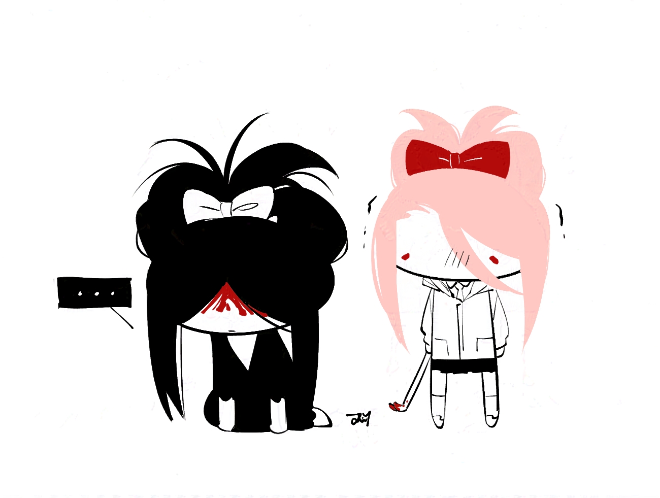 ... 1boy 1girl bbabbamis2 black_hair black_kimono blood blood_on_face bloody_weapon bow chibi commentary_request crowbar full_body hair_bow holding holding_crowbar homicipher japanese_clothes kimono korean_commentary long_hair pink_hair raincoat red_eyes simple_background skirt spoken_ellipsis weapon white_background