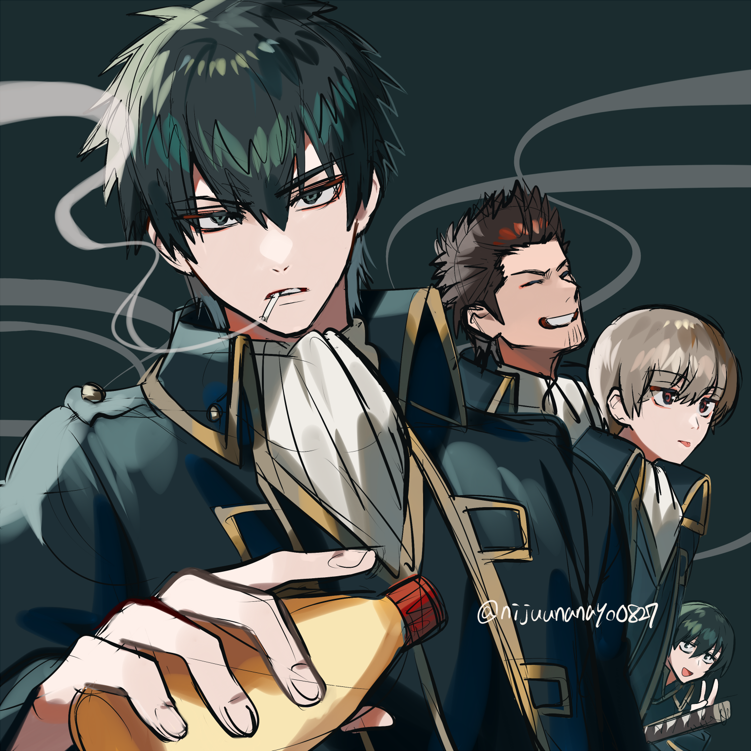 4boys black_background black_hair black_jacket bottle brown_eyes brown_hair cigarette closed_eyes commentary_request gintama grey_eyes grin hair_between_eyes highres hijikata_toushirou holding holding_bottle jacket katana kondou_isao looking_at_viewer male_focus mayonnaise_bottle mouth_hold multiple_boys ninahachi okita_sougo open_clothes open_jacket shinsengumi_(gintama) smile smoke smoking sword thick_eyebrows tongue tongue_out v weapon yamazaki_sagaru