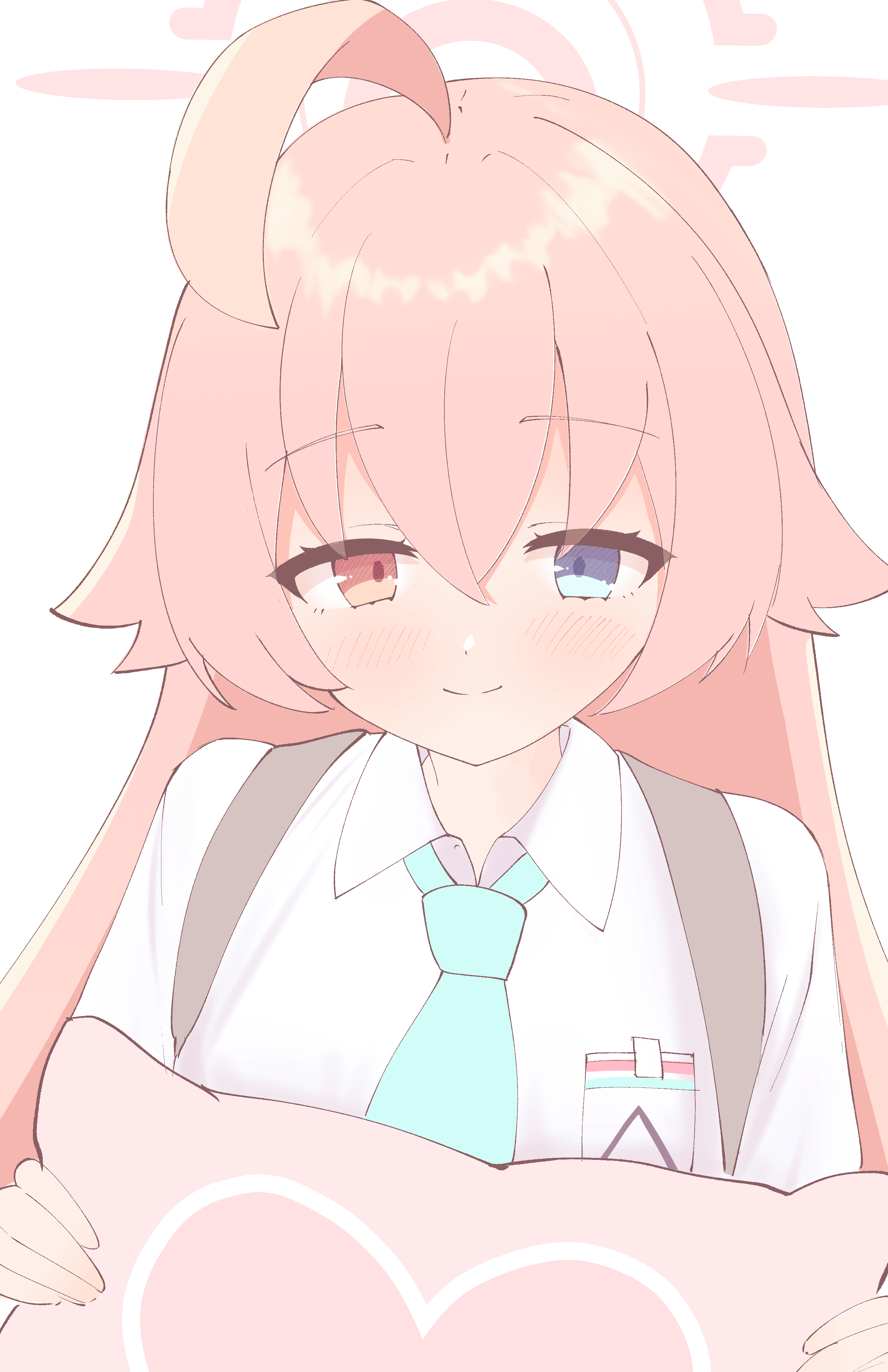1girl absurdres ahoge aqua_necktie blue_archive blue_eyes blush closed_mouth commentary dot_nose hair_between_eyes halo heterochromia highres holding holding_pillow hoshino_(blue_archive) id_card ks_aya_(gztm4838) long_hair looking_at_viewer necktie orange_eyes pillow pink_hair pink_halo shirt smile solo upper_body white_shirt yes-no_pillow