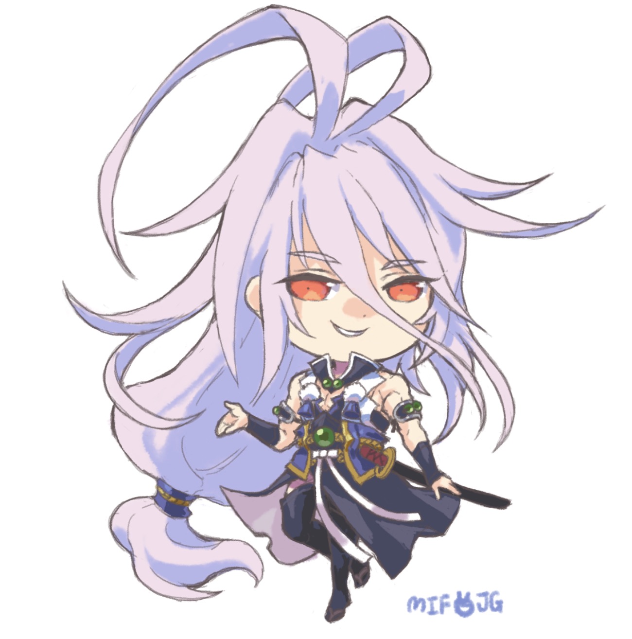 1boy antenna_hair black_thighhighs chibi chibi_only full_body grin hair_between_eyes highres long_hair looking_at_viewer male_focus mif_(jgjgjgjg) orange_eyes purple_hair sandals sengo_muramasa_(touken_ranbu) signature simple_background smile solo sword thighhighs toned toned_male touken_ranbu very_long_hair weapon white_background