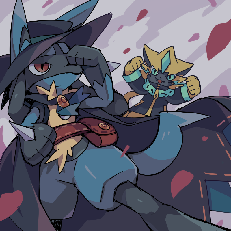 2others bag black_cape black_jacket cape clothed_pokemon fangs furry gen_4_pokemon gen_7_pokemon grey_background jacket legendary_pokemon looking_ahead lucario lucario_(costume_party) multiple_others mythical_pokemon neonraizu nintendo open_mouth other_focus petals pokemon pokemon_(creature) pokemon_unite red_eyes satchel slit_pupils zeraora zeraora_(band) zipper_pull_tab