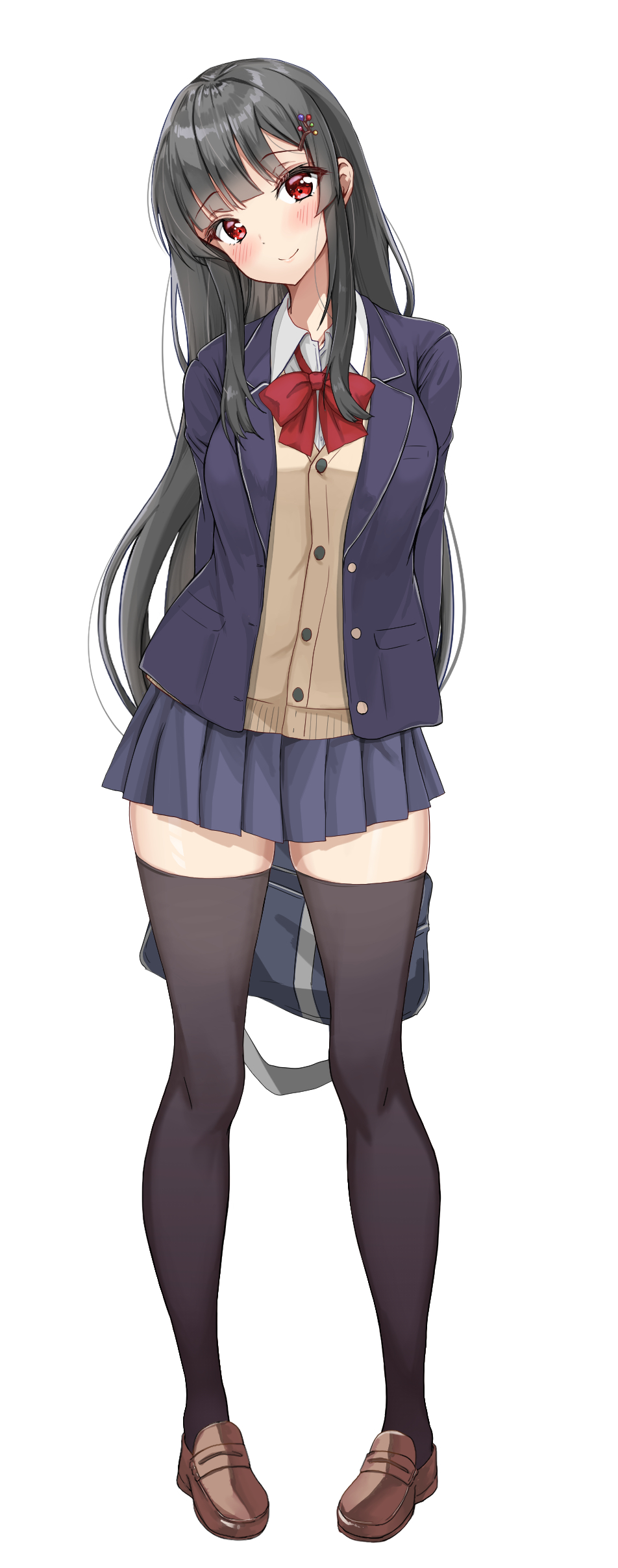 1girl absurdres amagi_(amagi626) arms_behind_back bag black_hair black_thighhighs blue_jacket blue_skirt blunt_bangs bow bowtie breasts buttons cardigan commentary_request dress_shirt full_body hair_ornament hairclip head_tilt highres holding holding_bag jacket long_hair looking_at_viewer medium_breasts miniskirt open_clothes open_jacket original pleated_skirt red_bow red_bowtie red_eyes school_bag school_uniform shirt simple_background skirt smile solo straight_hair thighhighs thighs white_background white_shirt yellow_cardigan zettai_ryouiki