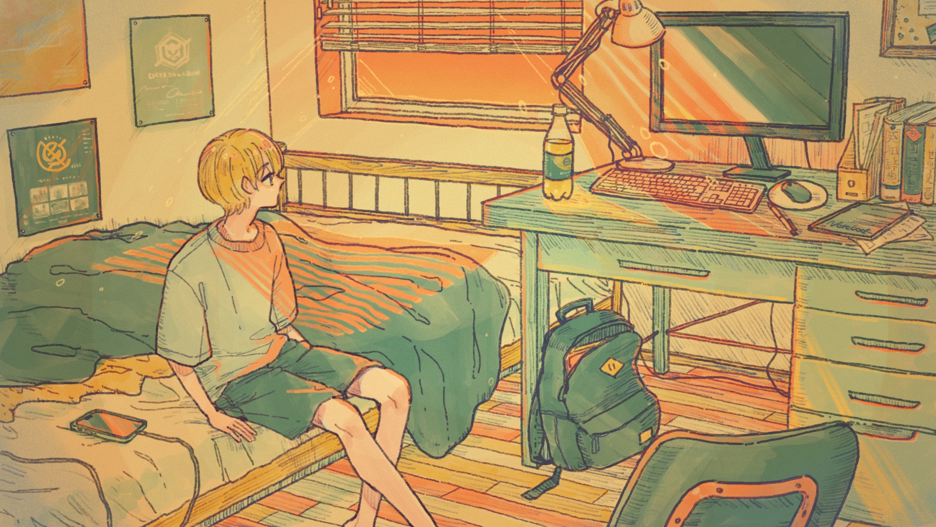 1boy backpack bag bed bedroom blonde_hair book bottle cellphone chair charging_device commission computer_keyboard computer_mouse desk desk_lamp evening highres indoors lamp looking_outside male_focus monitor notebook on_bed original phone port_(portzzz) poster_(object) procreate_(medium) shirt short_hair short_sleeves shorts sitting slice_of_life smartphone solo window window_blinds