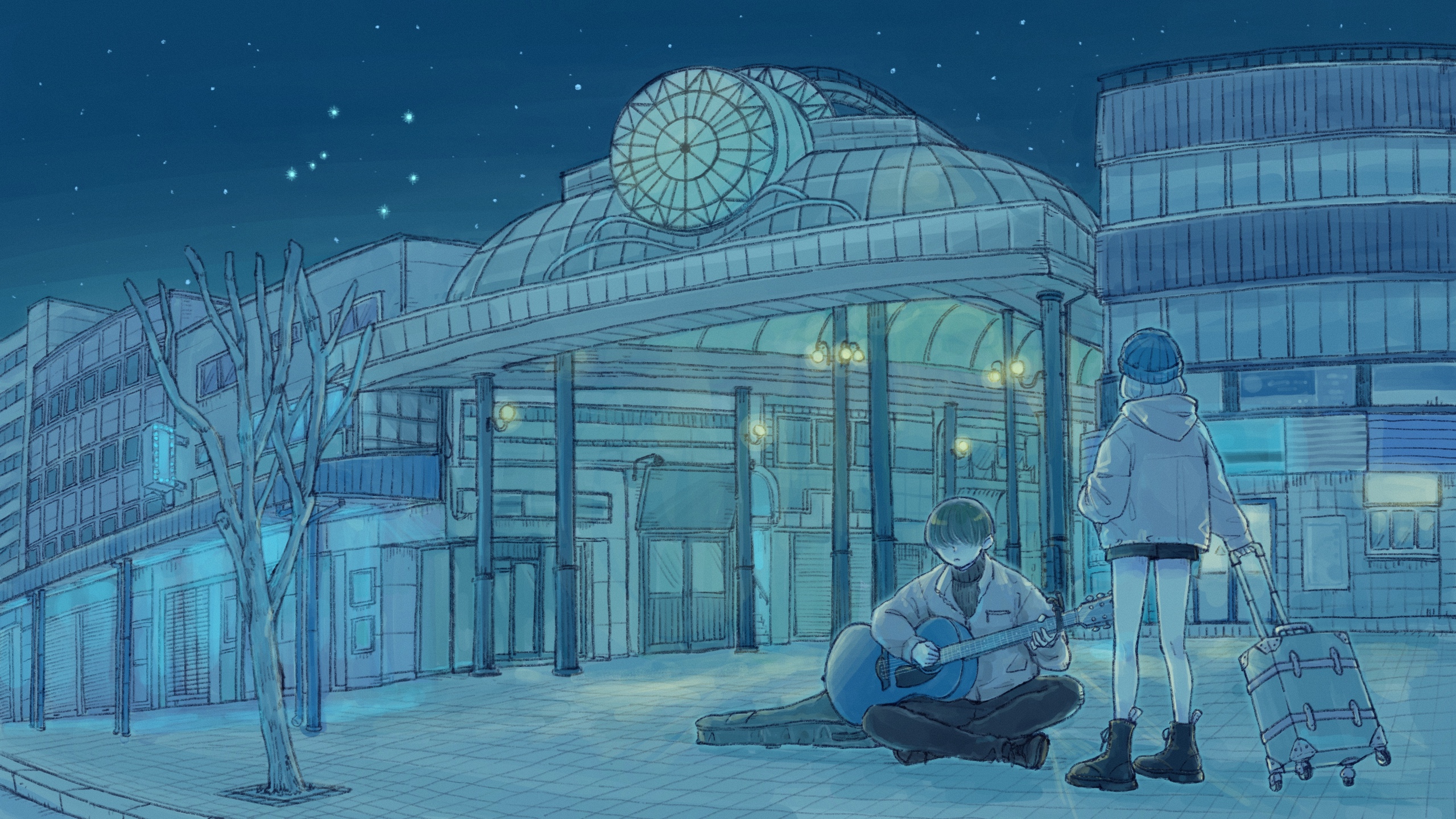 1boy 1girl bare_tree black_footwear blue_theme boots building commission facing_away guitar highres holding holding_suitcase hood hood_down hoodie indian_style instrument jacket long_sleeves music night on_floor original outdoors pants playing_guitar playing_instrument port_(portzzz) procreate_(medium) scenery short_hair sitting sky standing star_(sky) starry_sky suitcase town tree wide_shot