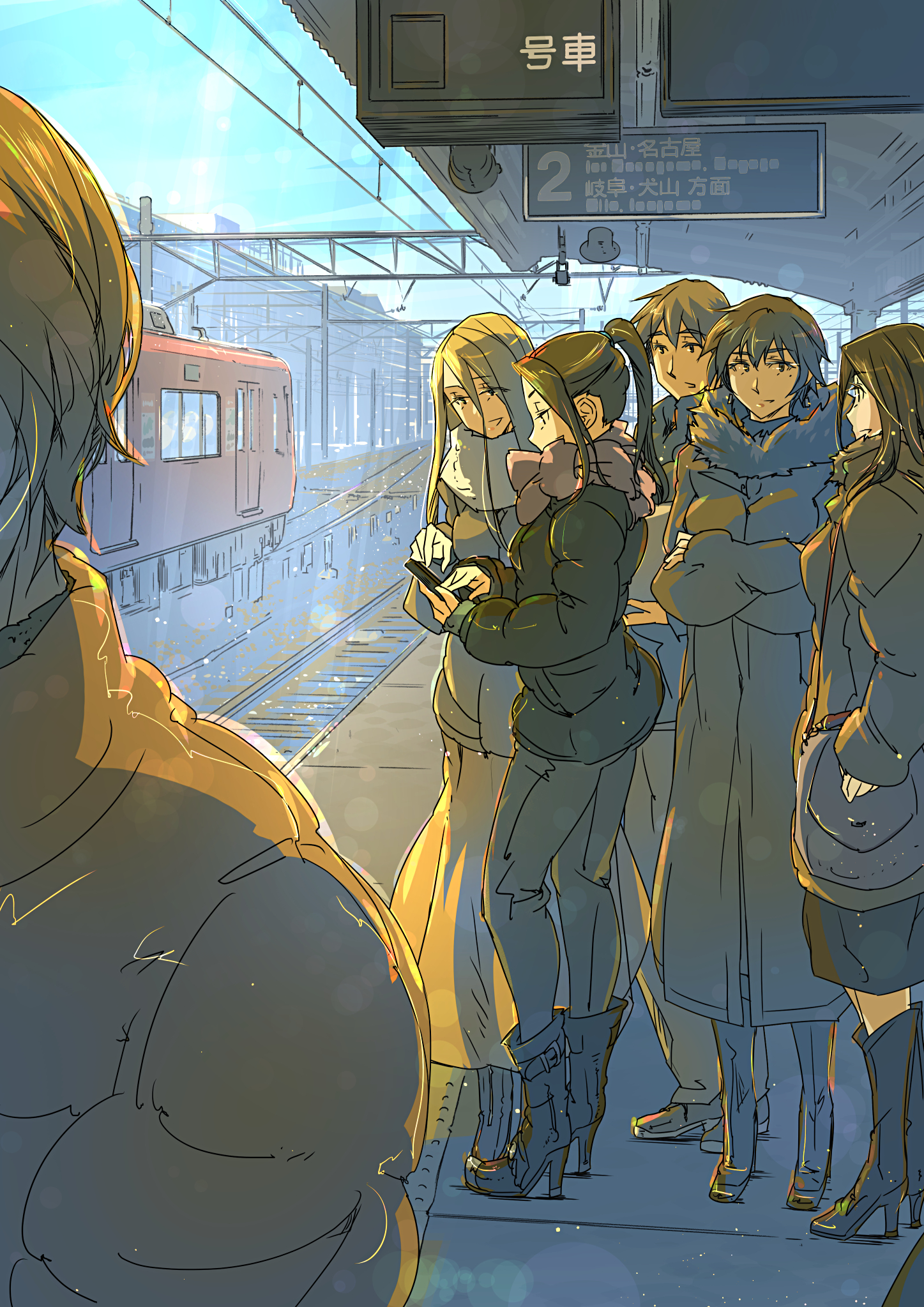 2boys 4girls boots cellphone coat crossed_arms fur-trimmed_coat fur_trim hair_between_eyes high_heel_boots high_heels highres holding holding_phone jacket long_hair long_skirt looking_at_phone multiple_boys multiple_girls original phone ponytail railroad_tracks scarf short_hair skirt smartphone standing supe_(yuusyasupepen) train train_station_platform winter