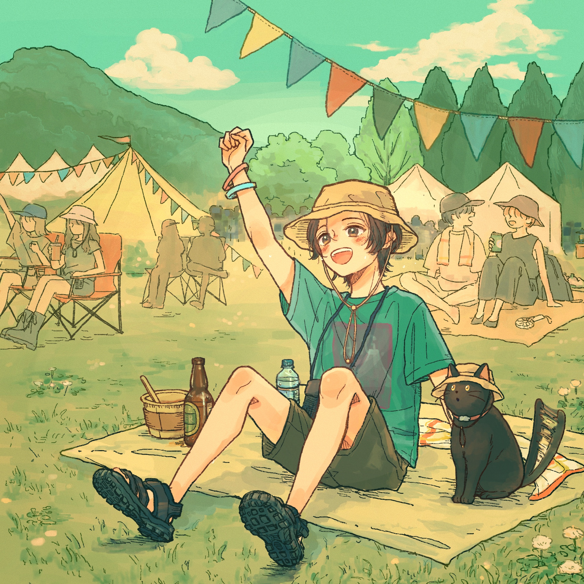 1boy animal arm_up beer_bottle black_cat black_footwear blue_sky bottle brown_eyes brown_hair cat cloud day grass green_shirt hat highres male_focus mountain multiple_others on_blanket on_floor open_mouth original outdoors port_(portzzz) sandals scenery shirt short_hair shorts sitting sky smile string_of_flags summer summer_festival tail tail_wagging teeth tent towel tree upper_teeth_only water_bottle wristband