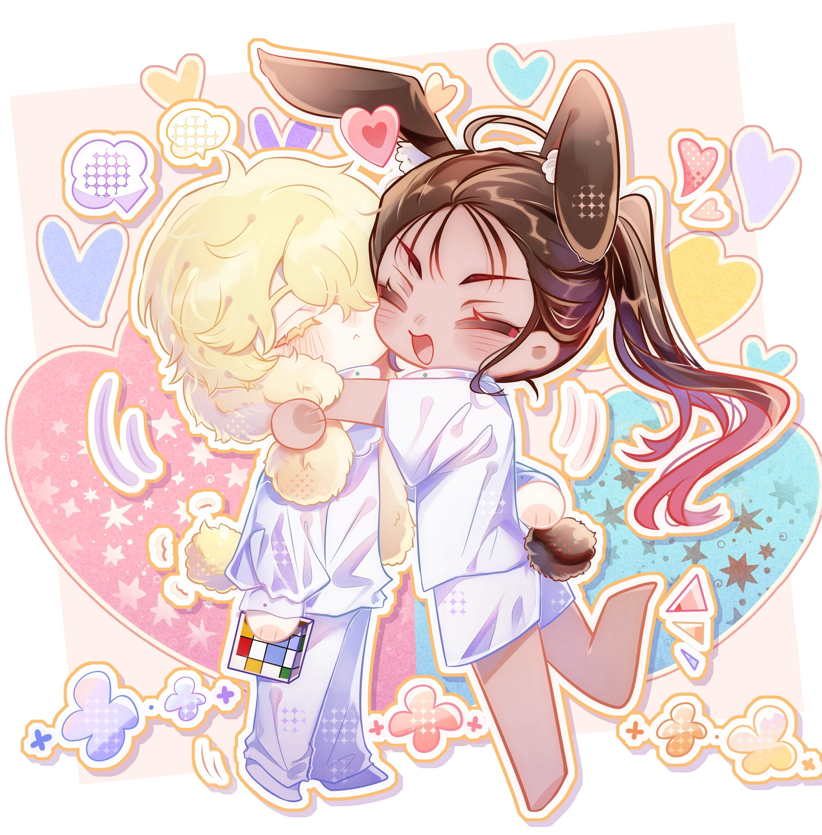 1boy 1girl absurdres alien_stage animal_ears barefoot blonde_hair blush brown_hair chinese_commentary closed_eyes commentary_request dark-skinned_female dark_skin floppy_ears foot_up heart highres holding holding_toy hyuna_(alien_stage) long_hair luka_(alien_stage) open_mouth pants ponytail rabbit_ears rubik's_cube shirt shorts smile toy very_long_hair white_pants white_shirt white_shorts yingjing_da_mao_fu