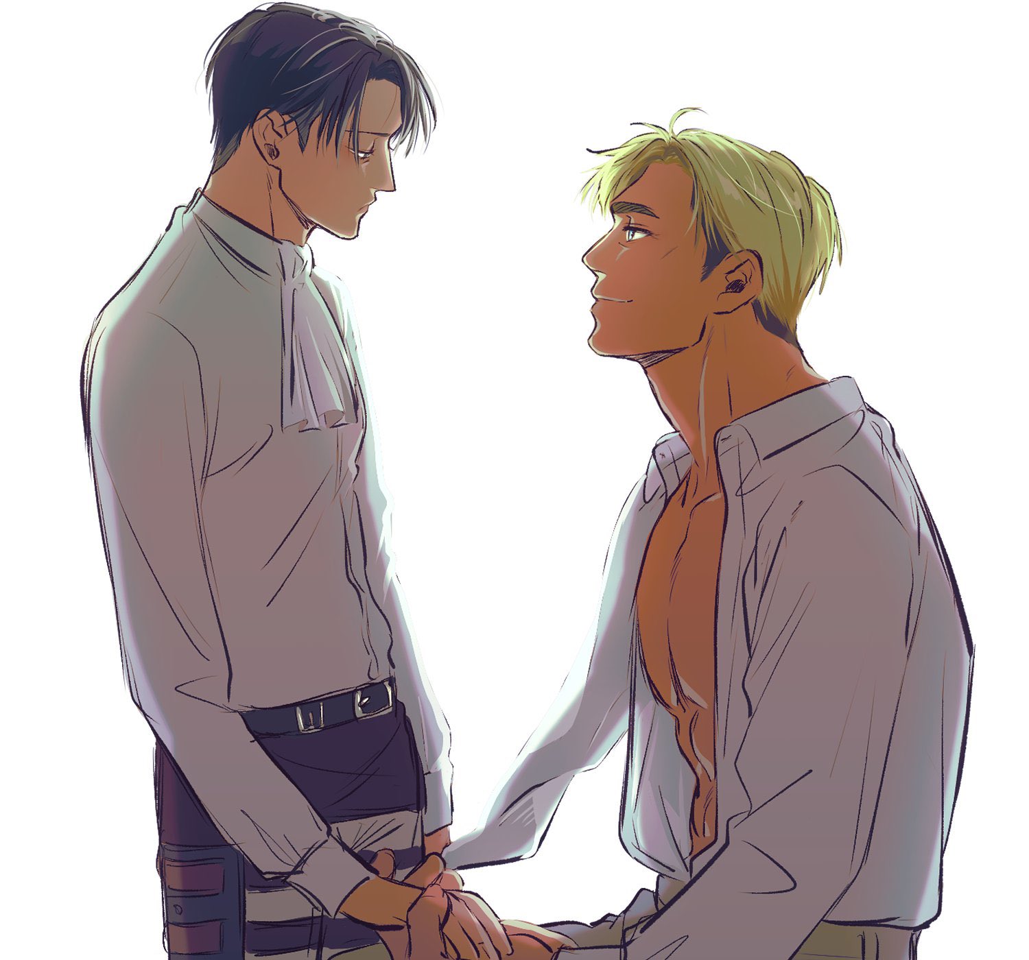2boys abs amputee ascot bare_pectorals belt belt_buckle black_belt blonde_hair blue_eyes brown_hair buckle closed_mouth collarbone collared_shirt commentary_request cotton100_me couple erwin_smith eye_contact highres holding_hands kneeling levi_(shingeki_no_kyojin) long_sleeves looking_at_another male_focus amputee multiple_belts multiple_boys open_clothes open_shirt pectorals pouch profile shingeki_no_kyojin shirt shirt_tucked_in smile thigh_belt thigh_pouch thigh_strap white_ascot white_shirt wing_collar yaoi