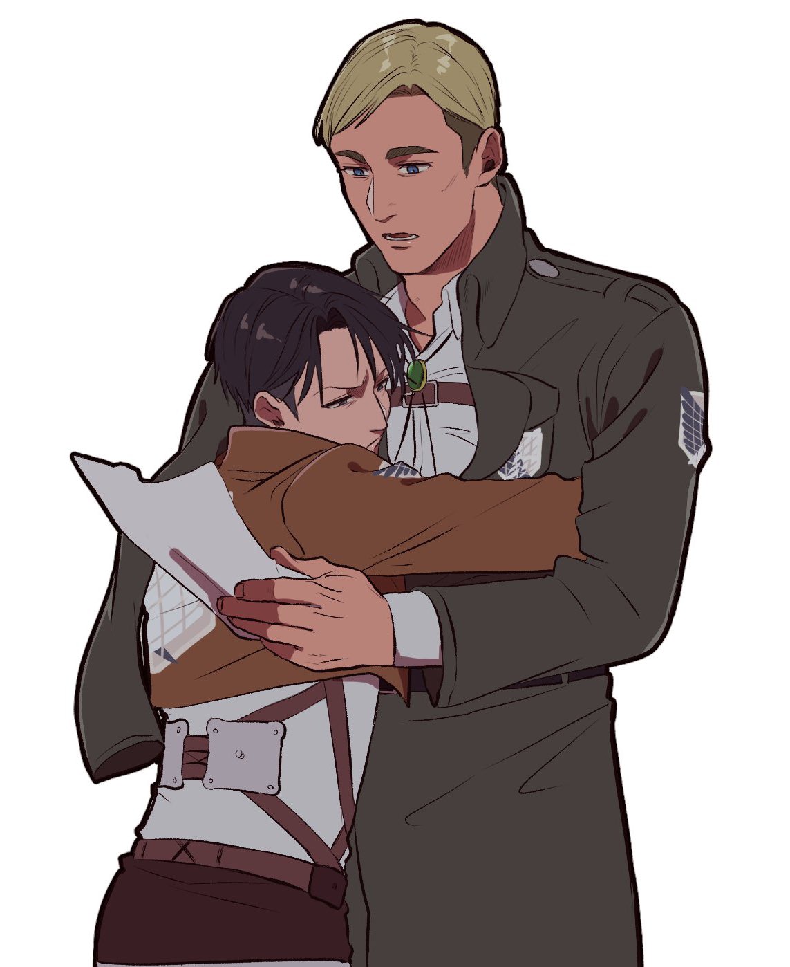 2boys adam's_apple arm_out_of_sleeve belt belt_buckle black_pants blonde_hair blue_eyes bolo_tie brown_belt brown_eyes brown_hair brown_jacket buckle chest_belt closed_mouth coat collared_coat collared_shirt commentary_request cotton100_me couple cowboy_shot cropped_jacket erwin_smith grey_coat highres holding holding_paper hug jacket layered_sleeves levi_(shingeki_no_kyojin) long_sleeves lower_teeth_only male_focus military_uniform multicolored_hair multiple_boys open_clothes open_coat open_collar open_mouth pants paper paradis_military_uniform shingeki_no_kyojin shirt simple_background teeth thick_eyebrows two-tone_hair white_background white_shirt wing_collar yaoi