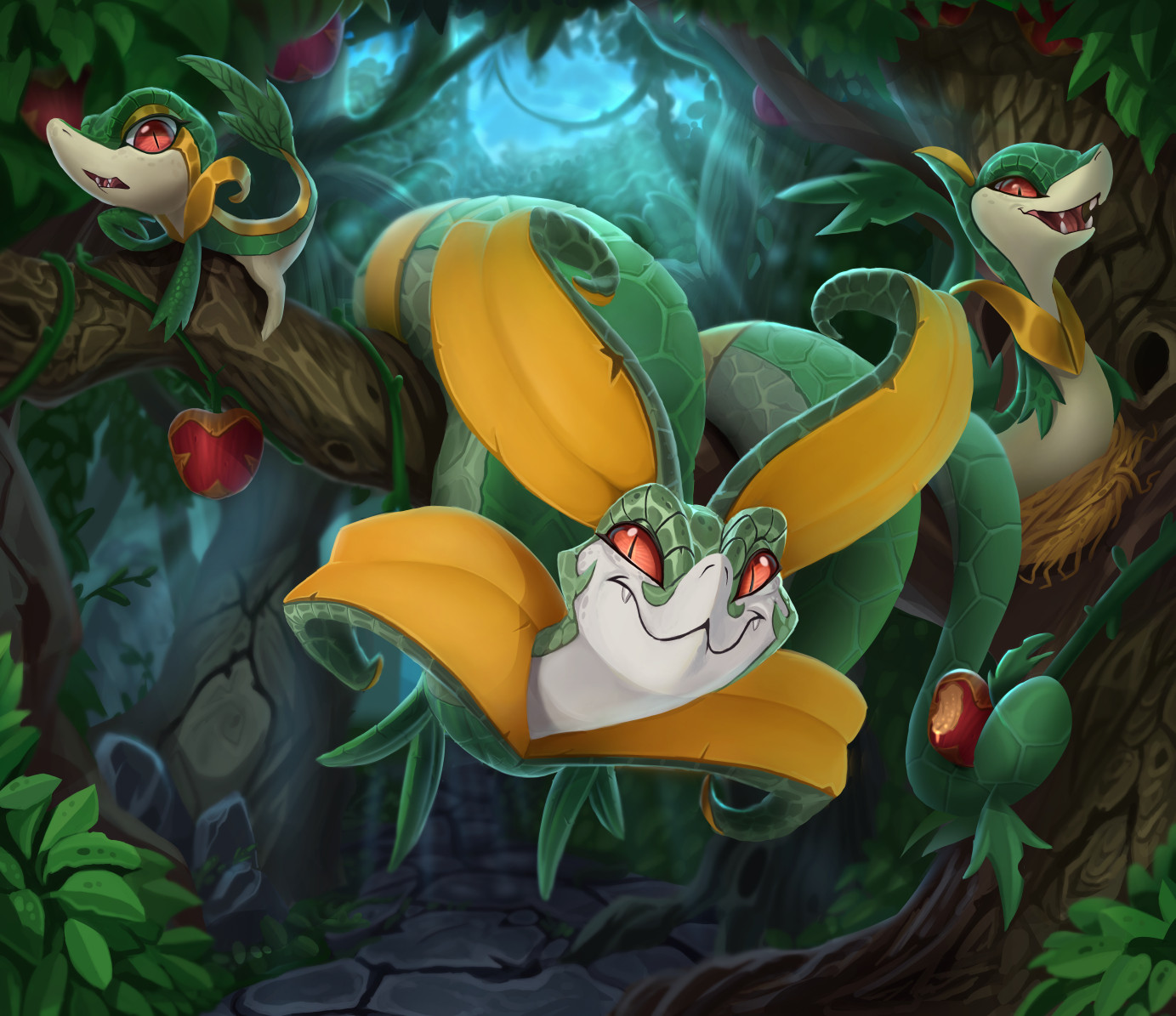 evolutionary_line food forest fruit gen_5_pokemon leaf looking_at_viewer mathew-b nature nintendo no_humans open_mouth orange_eyes plant pokemon pokemon_(creature) realistic serperior servine slit_pupils snivy tree vines