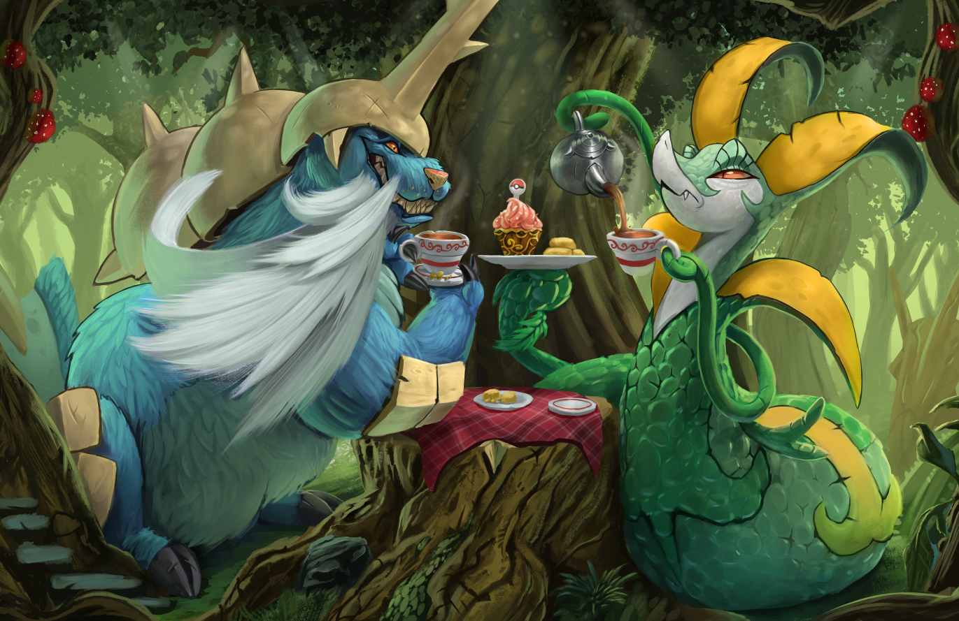 blue_fur cup cupcake food forest gen_5_pokemon grin holding holding_cup leaf mathew-b nature nintendo no_humans orange_eyes plate pokemon pokemon_(creature) realistic samurott serperior sharp_teeth slit_pupils smile tea teapot teeth tree