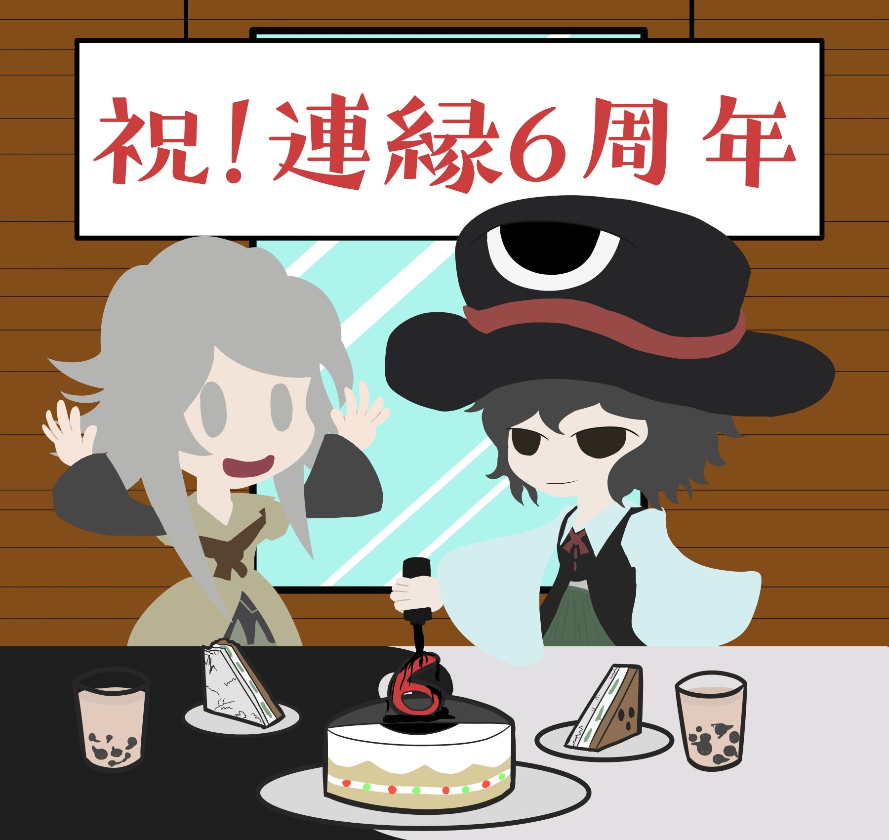 anniversary ascot black_coat black_eyes black_hair black_hat black_kimono black_shorts book_of_the_cafe bottle brown_ascot brown_coat bubble_tea cake closed_mouth coat collared_coat collared_shirt commentary_request cup day drinking_glass enraku_tsubakura eye_of_senri finite_zamenis food green_hakama green_shorts grey_eyes grey_hair hakama hands_up happy hat highres holding holding_bottle houlen_yabusame indoors ink japanese_clothes jinbei_(clothes) kimono lapels layered_sleeves len'en long_sleeves looking_at_another messy_hair neck_ribbon no_lineart notched_lapels official_style open_mouth plate puffy_short_sleeves puffy_sleeves red_ribbon ribbon ribbon-trimmed_coat ribbon_trim sandwich shirt short_hair short_hair_with_long_locks short_kimono short_over_long_sleeves short_sleeves shorts sleeveless sleeveless_coat smile solid_oval_eyes squeezing table tadpole top_hat two-tone_shorts white_shirt wide_sleeves window