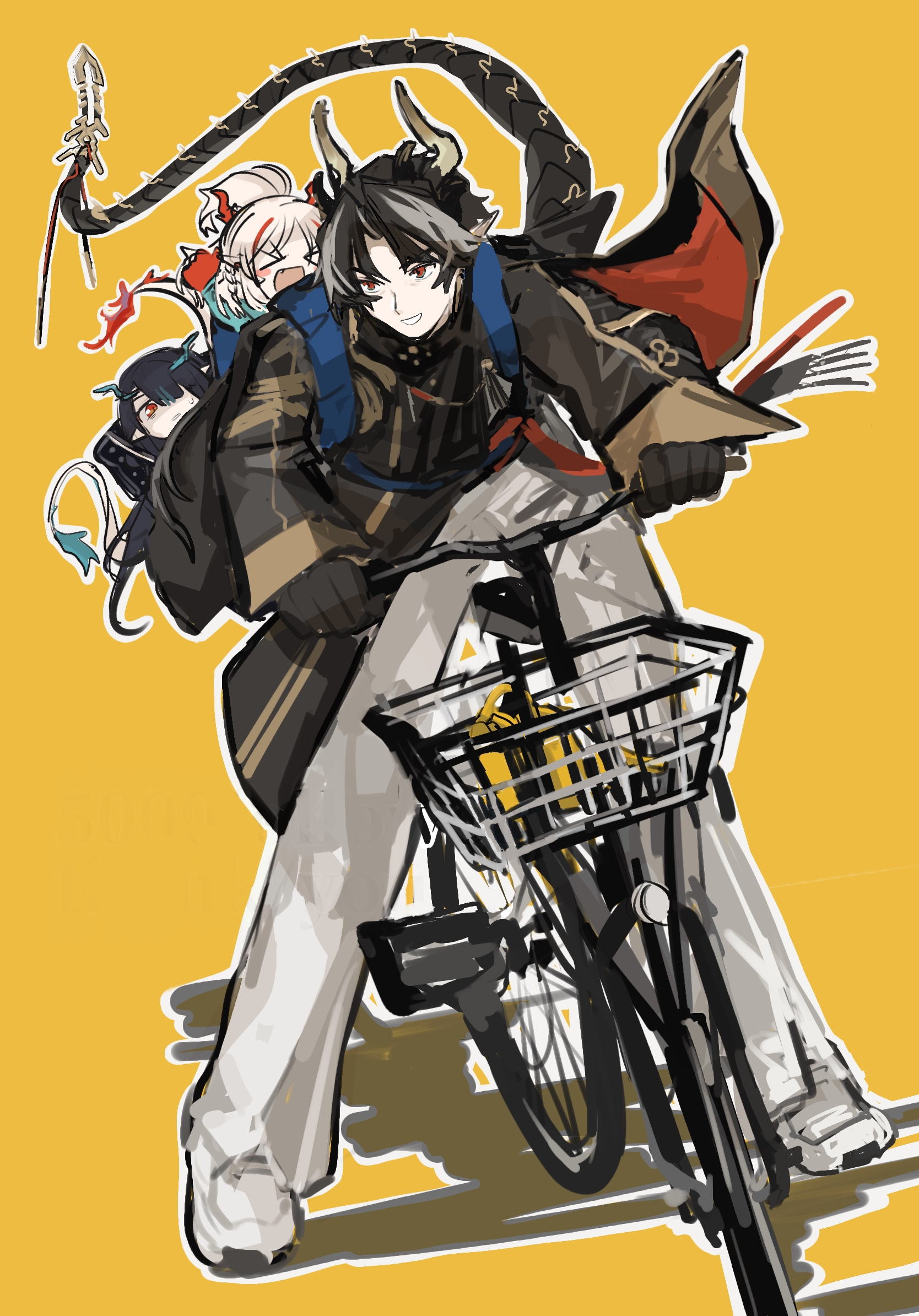1boy 2girls arknights bicycle bicycle_basket black_gloves black_hair black_jacket braid chibi chongyue_(arknights) commentary_request dragon_boy dragon_horns dragon_tail dusk_(arknights) gloves grey_hair grey_pants hair_over_one_eye highres horns jacket long_sleeves multicolored_hair multiple_girls nanataru10 nian_(arknights) outline pants parted_bangs parted_lips partial_commentary red_eyes red_hair riding riding_bicycle shadow shoes simple_background smile streaked_hair sweat tail textless_version thank_you white_footwear white_outline yellow_background