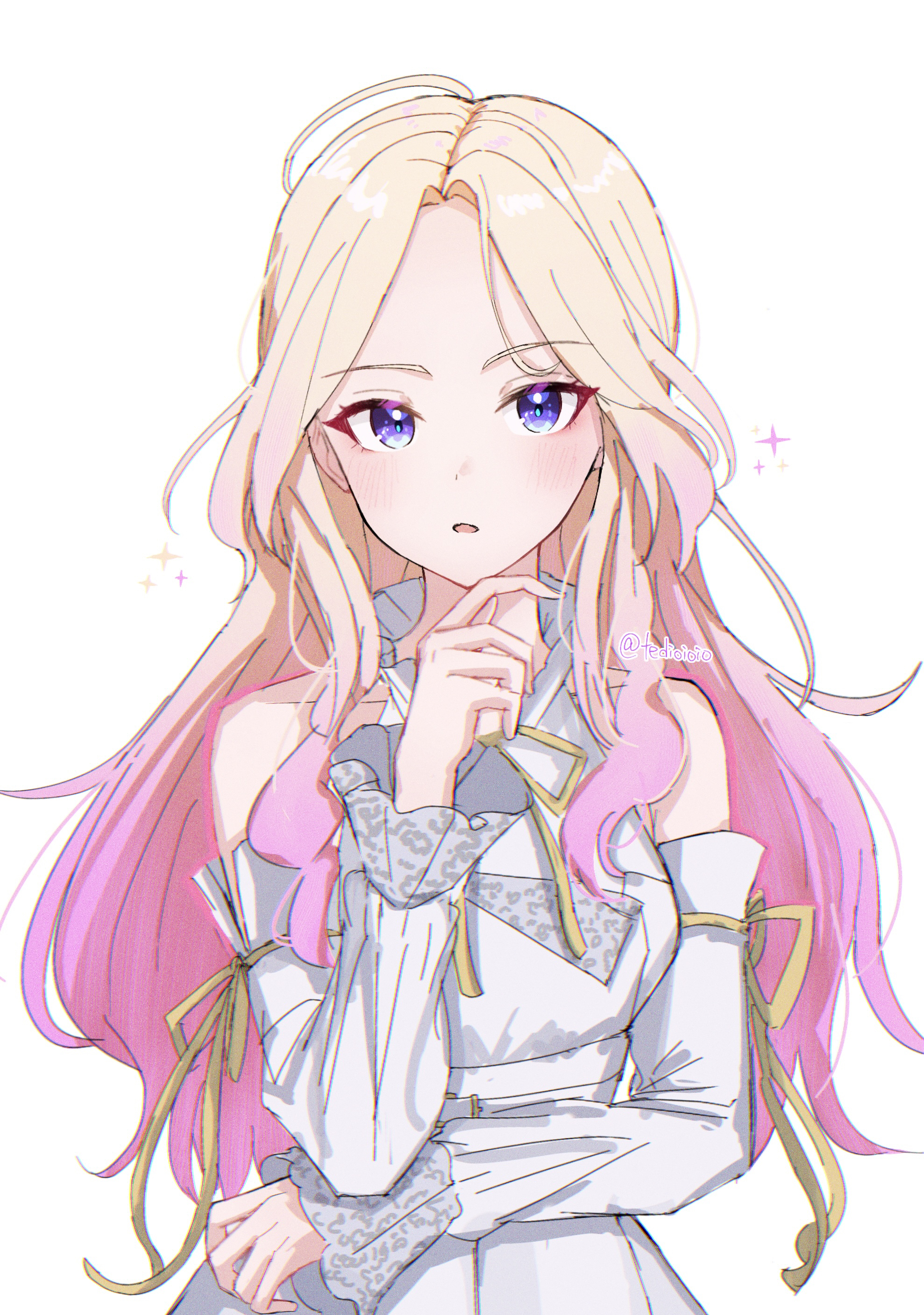 1girl :o absurdres blonde_hair blush breasts commentary_request curtained_hair detached_sleeves dress forehead gakuen_idolmaster grey_dress highres idolmaster juo_sena long_hair looking_at_viewer medium_breasts multicolored_hair pink_hair simple_background solo tedioioio twitter_username two-tone_hair very_long_hair white_background