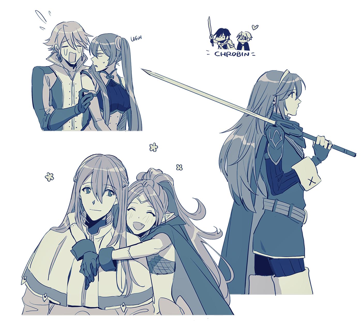 3girls 4boys cape chrom_(fire_emblem) closed_mouth crying falchion_(fire_emblem) fang fingerless_gloves fire_emblem fire_emblem_awakening gloves highres holding holding_sword holding_weapon hug hug_from_behind inigo_(fire_emblem) libra_(fire_emblem) long_hair long_sleeves lucina_(fire_emblem) male_robin_(fire_emblem) monochrome multiple_boys multiple_girls nintendo nowi_(fire_emblem) open_mouth pointy_ears ponytail severa_(fire_emblem) short_hair smile sophie_(693432) streaming_tears sweatdrop sword tears tiara twintails weapon