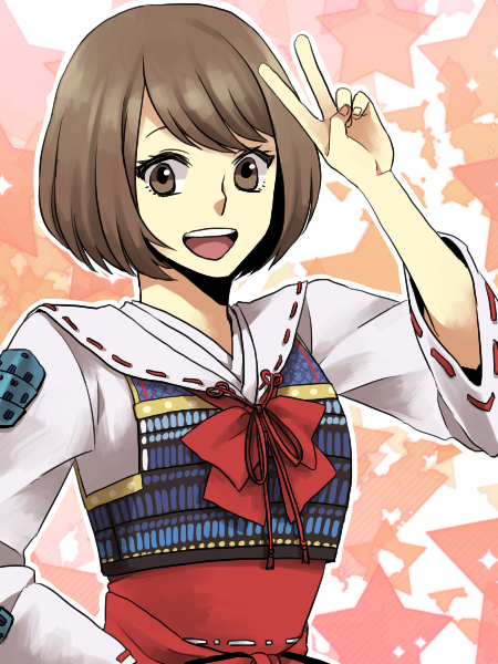 1girl :d bow bowtie brown_eyes brown_hair iroha_(hoptempo) long_sleeves looking_at_viewer open_mouth orange_background red_bow red_bowtie sailor_collar sengoku_basara short_hair smile solo star_(symbol) star_symbol_background tsuruhime_(sengoku_basara) upper_body v v_over_head white_sailor_collar