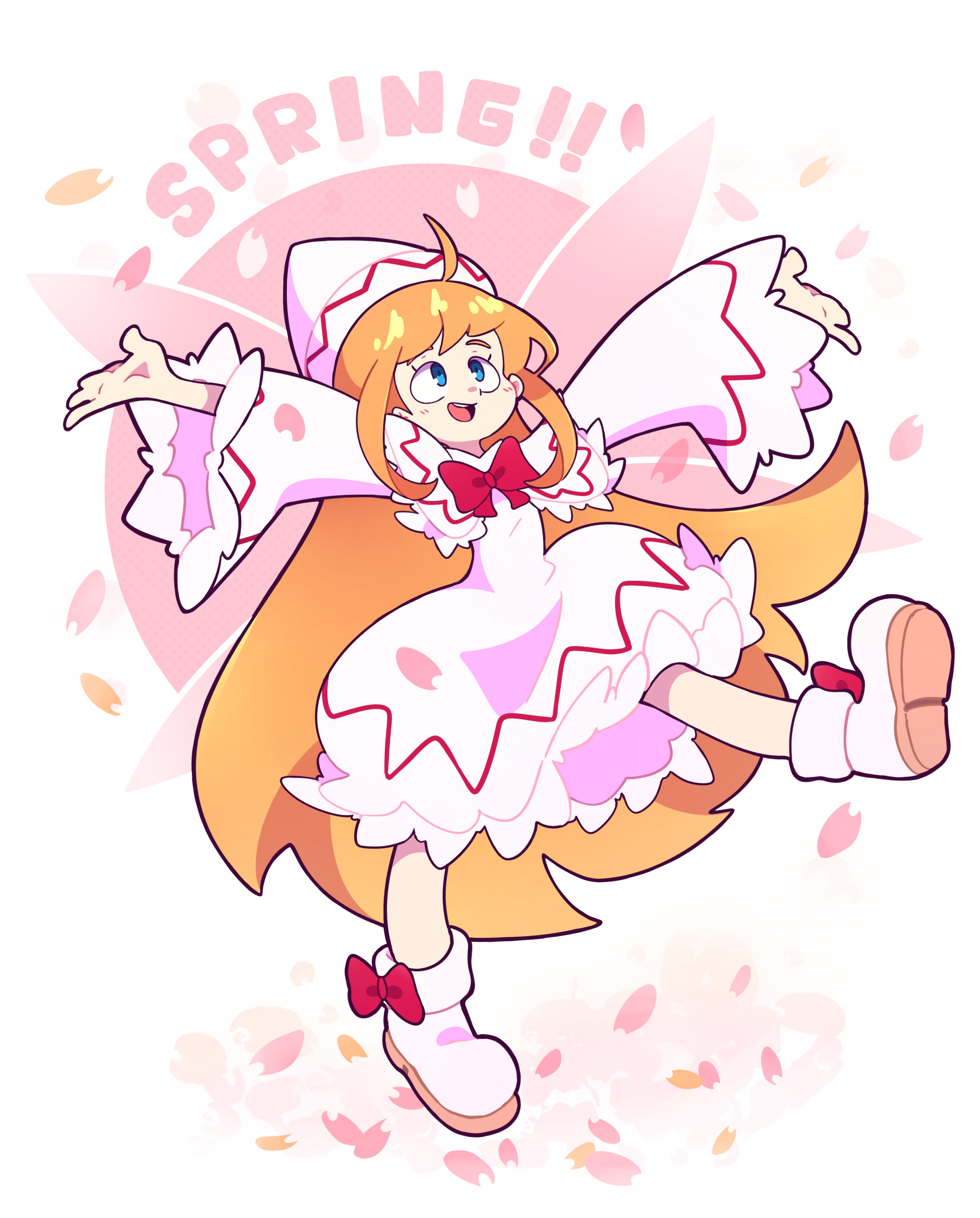 1girl absurdres ahoge blonde_hair blue_eyes bow eyelashes fairy_wings footwear_bow full_body hat highres lily_white long_hair long_sleeves maletoh open_mouth outstretched_arms petals red_ribbon ribbon solo touhou very_long_hair white_footwear white_hat wings