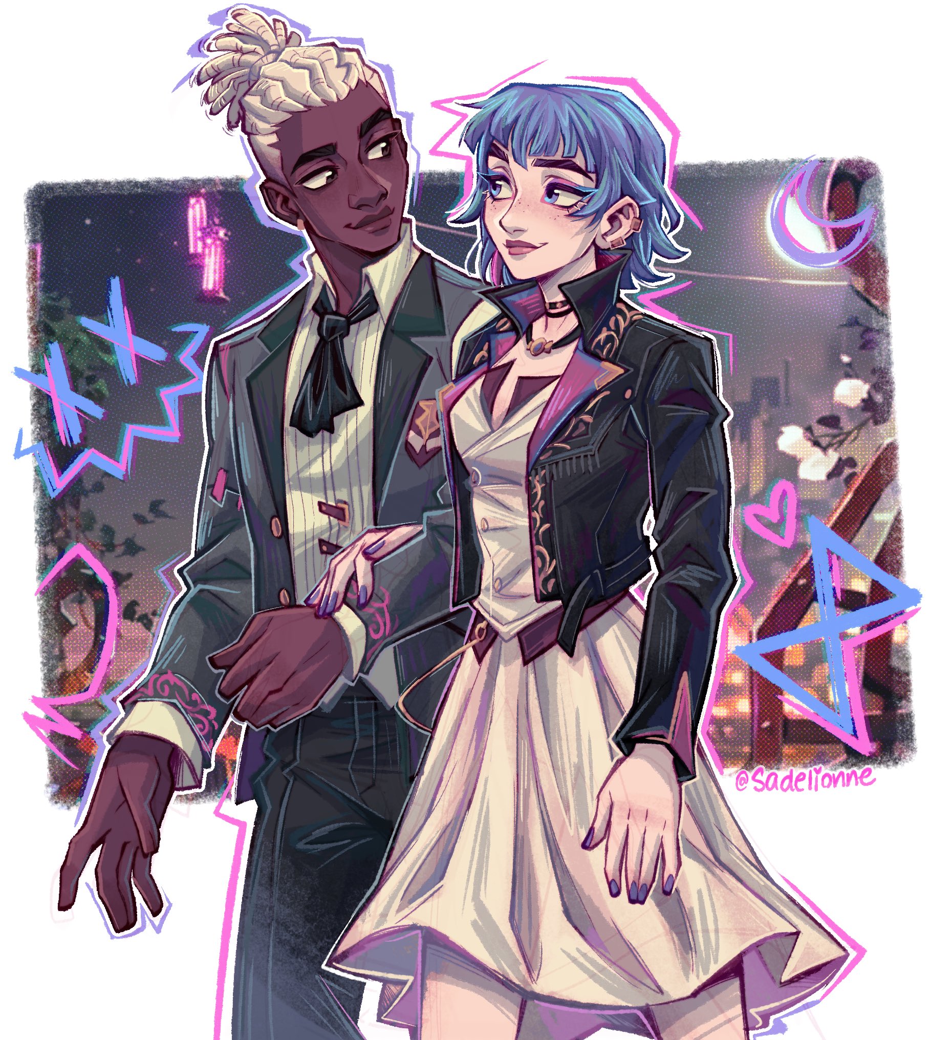 1boy 1girl arcane:_league_of_legends ascot black_ascot black_jacket black_pants blue_eyes blue_hair collared_shirt crescent_moon dark-skinned_male dark_skin dreadlocks earrings ekko_(league_of_legends) freckles green_jacket highres jacket jewelry jinx_(league_of_legends) league_of_legends long_sleeves looking_at_another moon nail_polish night open_clothes open_jacket outdoors pants powder_(alternate_timeline)_(arcane) sadelionne shirt short_hair skirt smile white_shirt white_skirt