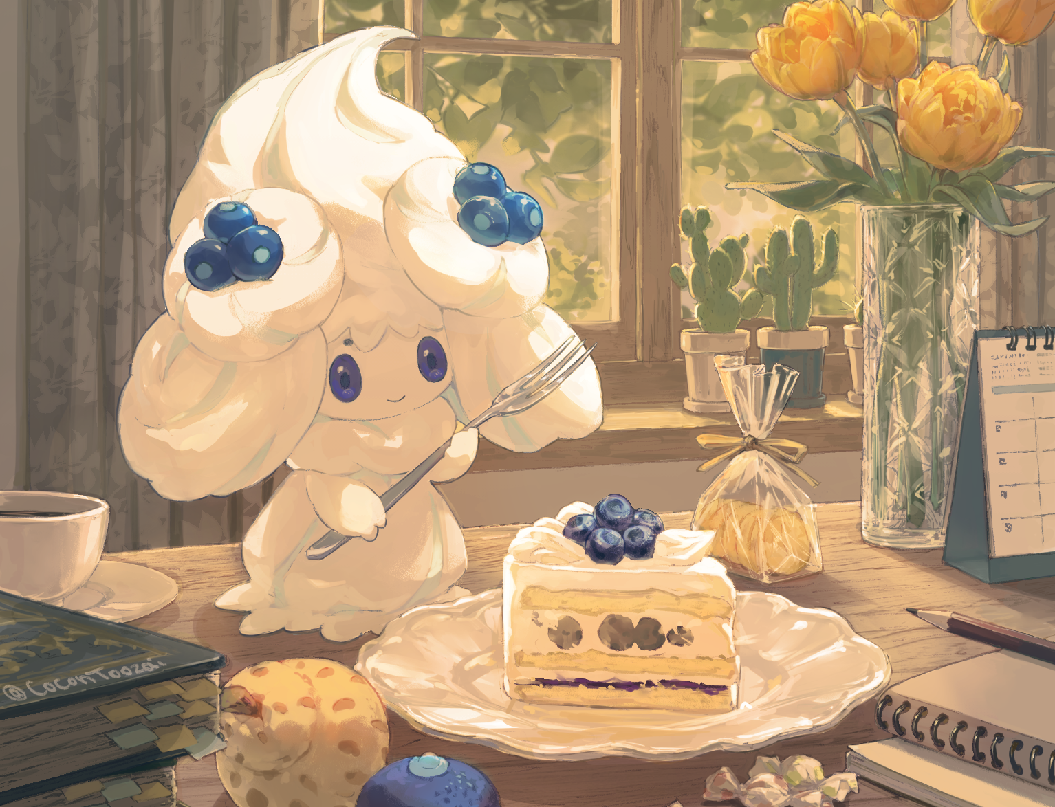 alcremie berry_(pokemon) book cactus cake cake_slice calendar_(object) candy_wrapper closed_mouth cocontoozai commentary_request cup curtains flower food fork gen_8_pokemon holding holding_fork indoors nintendo no_humans oran_berry pencil plate pokemon pokemon_(creature) saucer sitrus_berry smile solo vase window yellow_flower