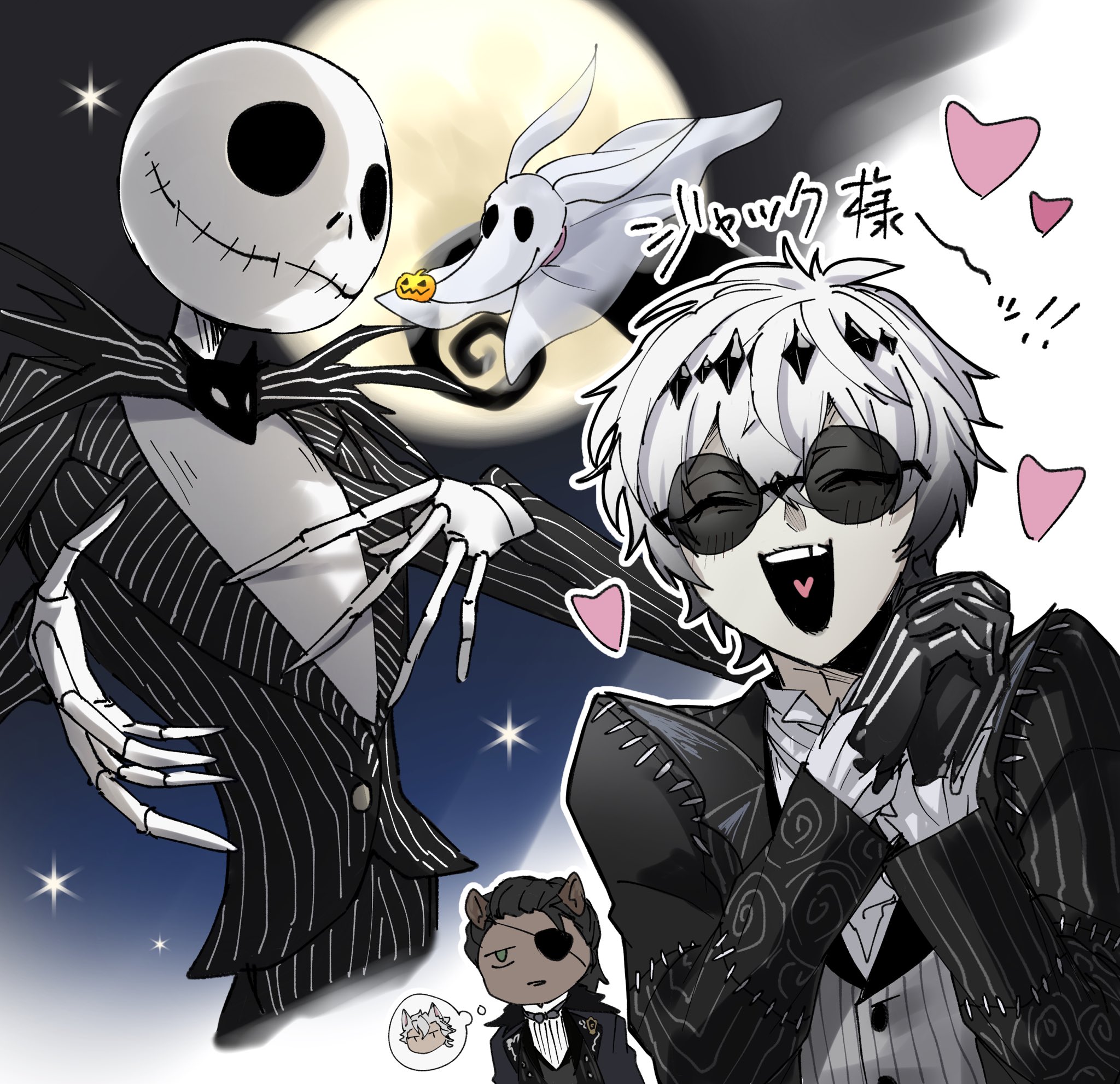 2boys :d ^_^ black_gloves black_hair black_hairband black_jacket closed_eyes dark-skinned_male dark_skin diamond_hairband eyepatch frilled_sleeves frills full_moon gloves grey_vest hair_between_eyes hairband hands_clasped_in_delight heart heart_in_mouth highres imagining jack_howl jacket leona_kingscholar leona_kingscholar_(nightmare_suit) long_sleeves male_focus mitsuro_illust moon multiple_boys open_clothes open_jacket open_mouth outline own_hands_clasped own_hands_together pinstripe_jacket pinstripe_pattern pinstripe_vest round_eyewear shirt short_hair skeleton skully_j._graves smile speech_bubble spoken_character stitches striped_clothes striped_jacket striped_vest sunglasses the_nightmare_before_christmas thought_bubble twisted_wonderland vertical-striped_clothes vertical-striped_jacket vertical-striped_vest vest white_hair white_outline white_shirt zero_(nbc)