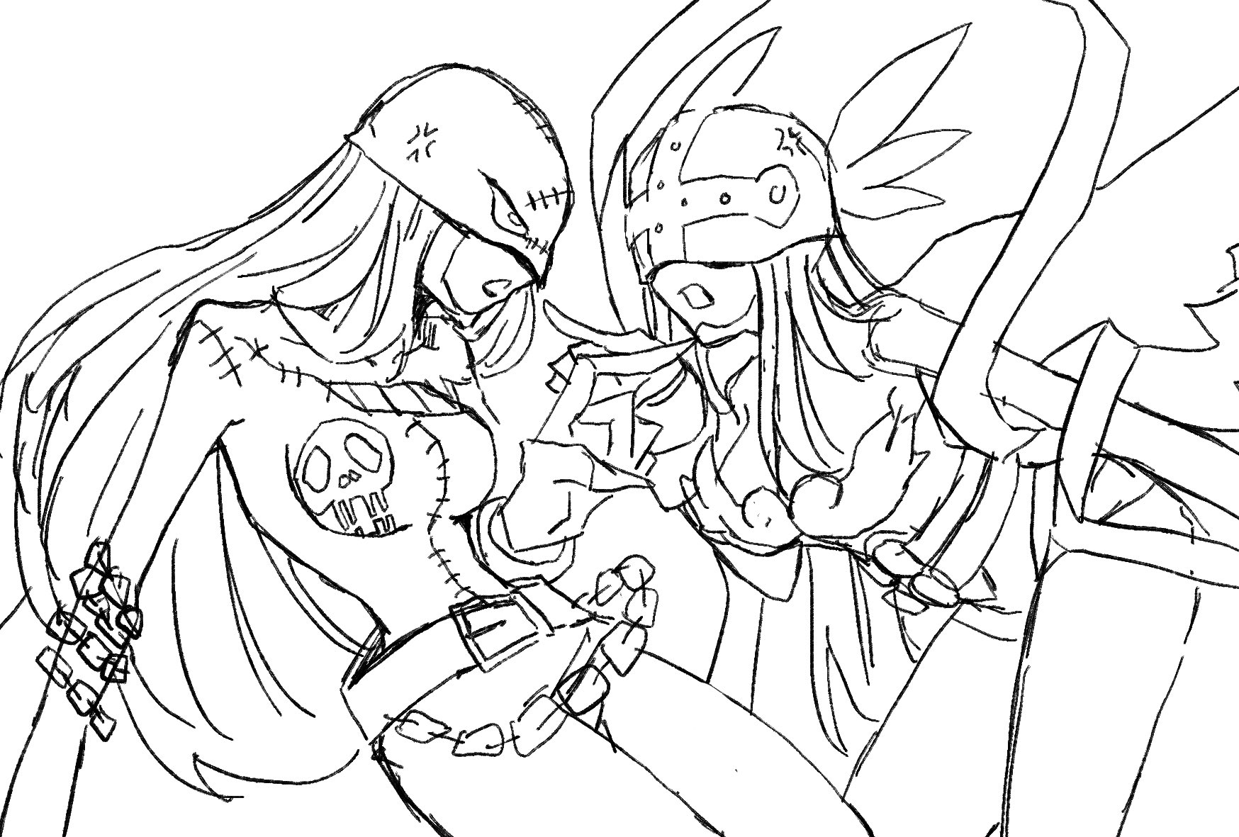 angel angel_girl angewomon demon demon_girl digimon digimon_(creature) fallen_angel head_wings highres ladydevimon long_hair mask wings