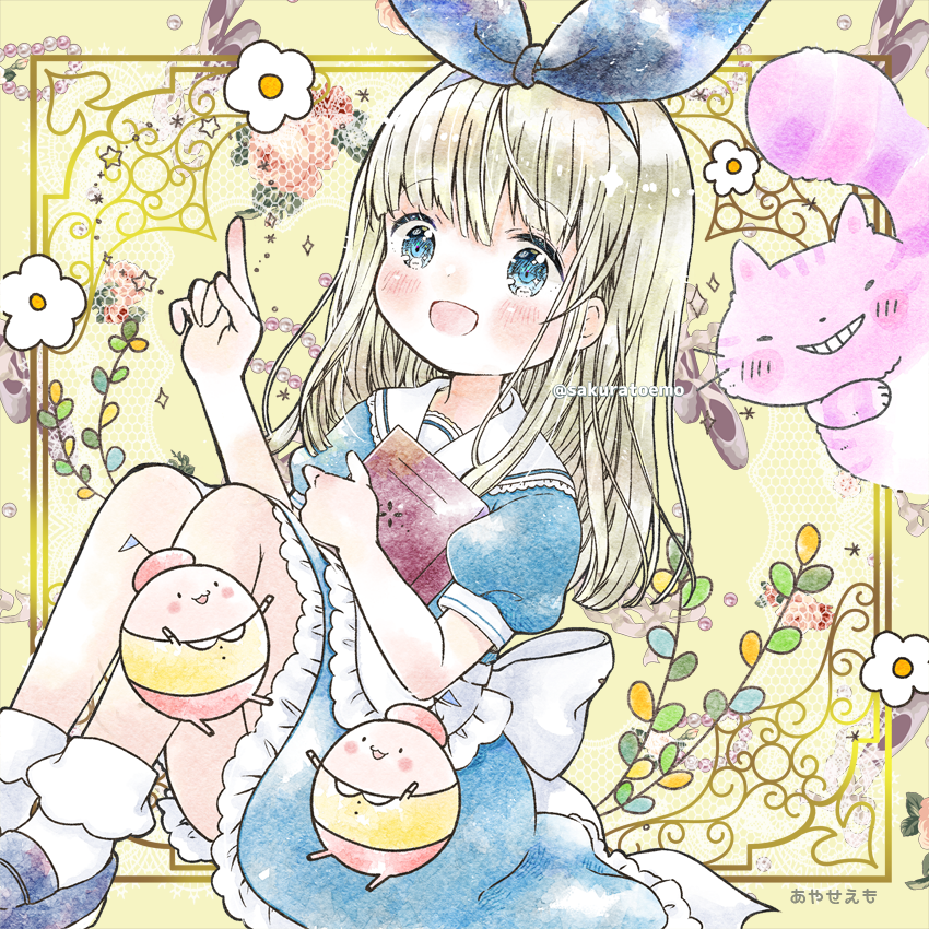 1girl alice_(alice_in_wonderland) alice's_adventures_in_wonderland apron artist_name blonde_hair blue_bow blue_dress blue_eyes blue_hairband blush book border bow cat cheshire_cat_(alice_in_wonderland) commentary dress emo_(mikan) floral_background flower frilled_apron frilled_dress frills hairband open_mouth original ornate_border outside_border petite pointing purple_fur sailor_collar sitting straight_hair tail tweedledee_(alice_in_wonderland) tweedledum_(alice_in_wonderland) waist_apron white_apron white_sailor_collar yellow_background