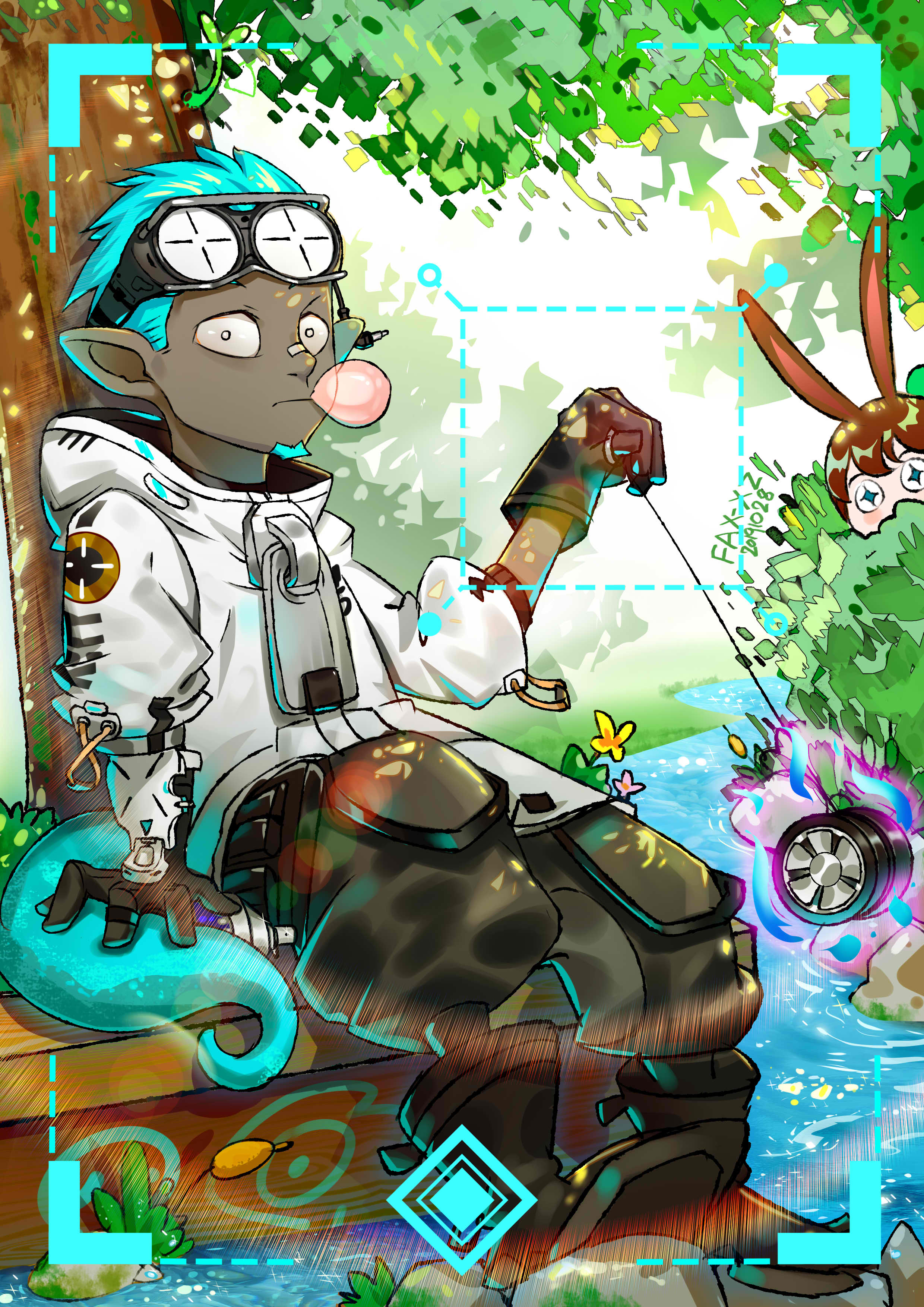 1375237417 1boy 1girl absurdres amiya_(arknights) animal_ears aqua_hair arknights black_gloves blue_hair brown_hair chameleon_tail dark-skinned_male dark_skin ethan_(arknights) facial_hair gloves goatee goggles goggles_on_head highres holding hood jacket long_hair looking_at_viewer male_focus outdoors pants pointy_ears rabbit_ears short_hair solo_focus tail yo-yo
