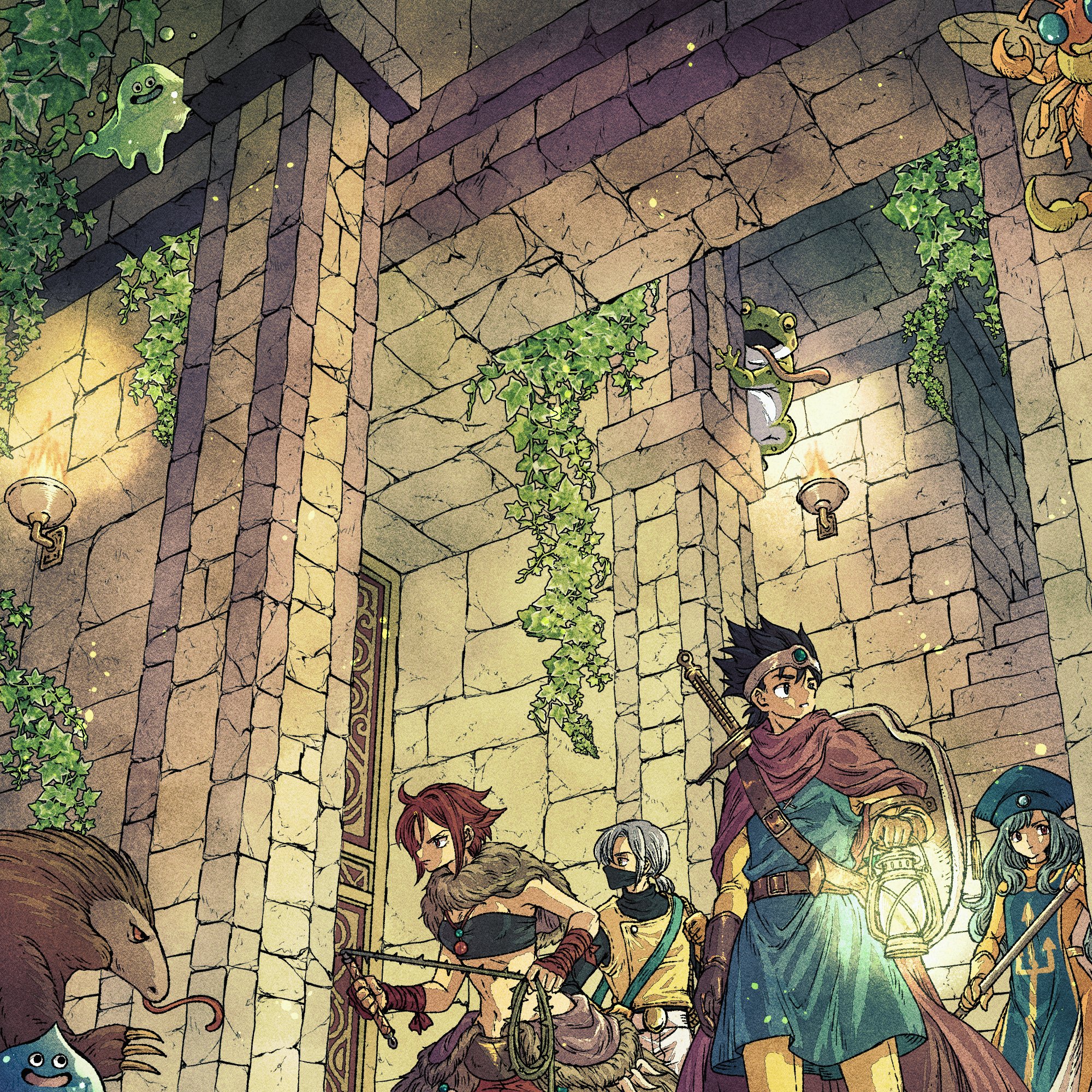 2boys 2girls anteater bag black_hair black_mask black_shirt blue_gem blue_hair blue_hat blue_tunic bodysuit breasts brown_hair cloak dragon_quest dragon_quest_iii dungeon frog fur_scarf gem grey_fur grey_hair hair_between_eyes hat hero_(dq3) highres holding holding_lantern holding_staff holding_whip jewelry lantern long_hair mask medium_breasts midriff monster_wrangler_(dq3) mouth_mask multiple_boys multiple_girls navel necklace pants priest_(dq3) red_cloak red_eyes roto_(dq3) shield shield_on_back shirt short_hair shoulder_bag slime_(creature) staff strapless thief_(dq3) tongue tongue_out torch toriga tube_top tunic upper_body vest weapon weapon_on_back whip yellow_bodysuit yellow_pants yellow_shirt yellow_vest
