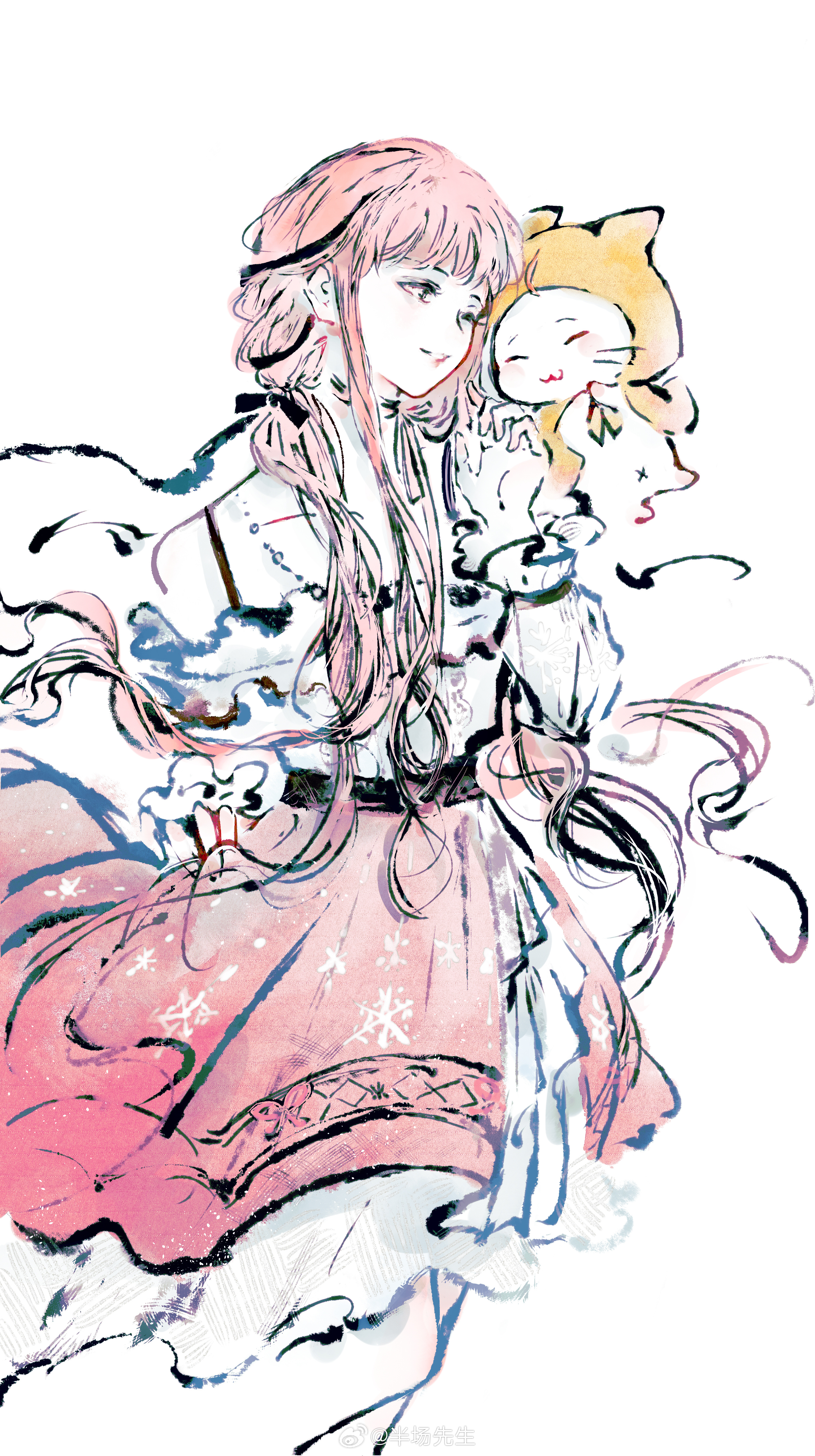 1girl ^_^ absurdres animal banchang_xiansheng bare_shoulders black_bow black_ribbon blush_stickers bow bra_strap brown_eyes capelet cat center_frills chinese_commentary closed_eyes closed_mouth clothed_animal collarbone commentary_request ear_covers eyelashes feet_out_of_frame frilled_skirt frilled_sleeves frills hair_bow hair_half_over_shoulder hair_ribbon happy heads_together highres hood hood_up infinity_nikki jewelry layered_skirt lipstick long_hair long_sleeves looking_at_animal low_twintails makeup miniskirt momo_(nikki) neck_ribbon necklace nikki_(nikki) nikki_(series) off-shoulder_shirt off_shoulder one_eye_closed parted_lips pink_hair pink_lips pink_skirt ribbon shirt simple_background skirt smile snowflake_print teeth tress_ribbon twintails very_long_hair watermark weibo_watermark whiskers white_background white_cat white_shirt white_skirt yellow_capelet yellow_ribbon