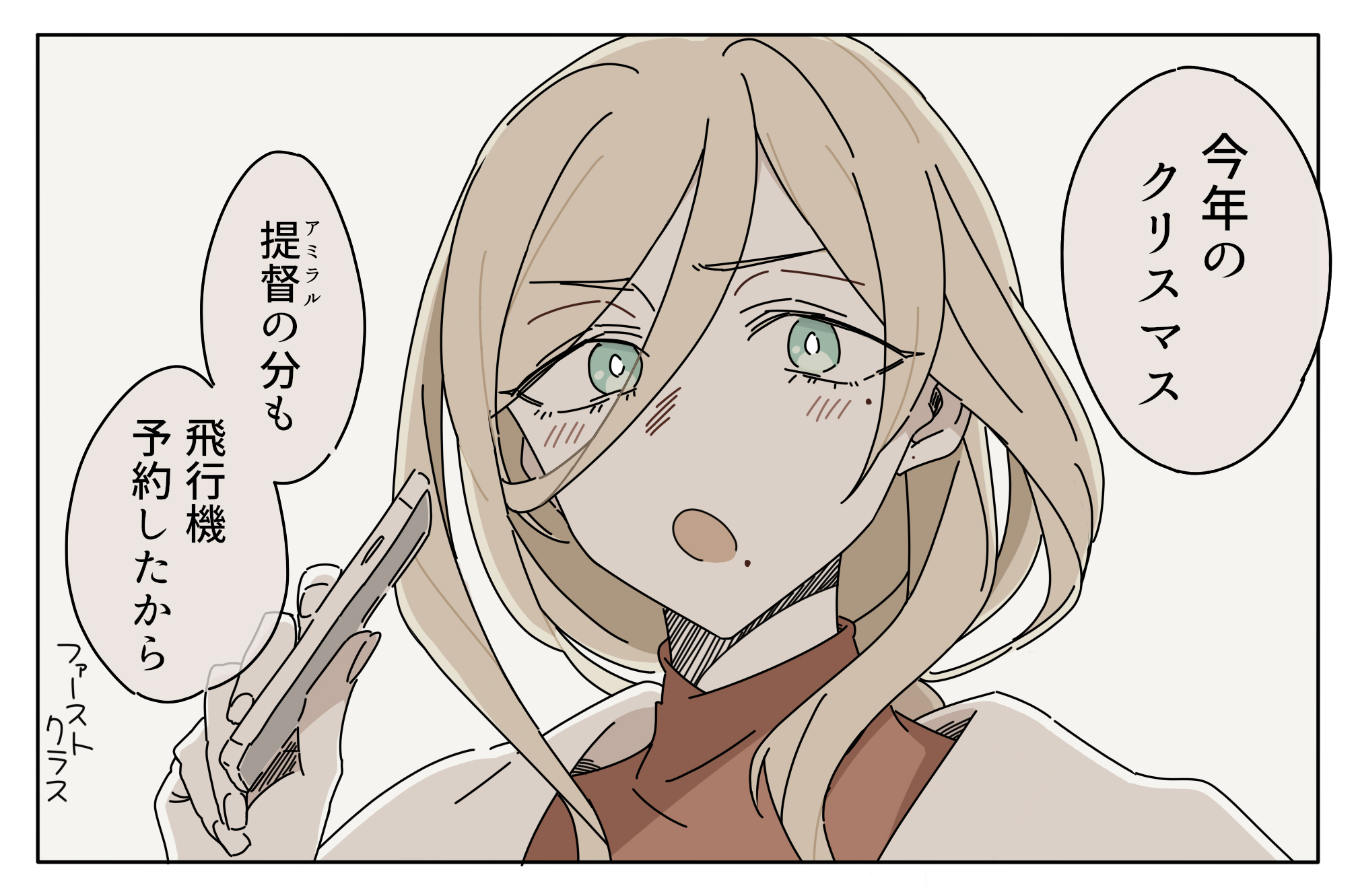 1girl anotsugini_kuruji blonde_hair blush cellphone coat green_hair highres holding holding_phone kantai_collection looking_at_viewer mole mole_under_eye mole_under_mouth open_clothes open_coat open_mouth phone richelieu_(kancolle) richelieu_deux_(kancolle) richelieu_deux_(winter)_(kancolle) simple_background smartphone solo translation_request